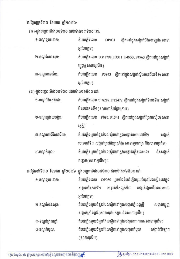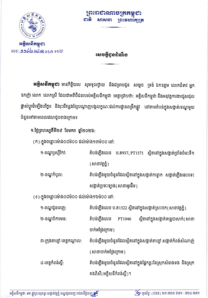 EDC ជូនដំណឹងពីការរអាក់រអួលចរន្ត តាមតំបន់សង្កាត់ ខណ្ឌ មួយចំនួនចាប់ពីថ្ងៃនេះ ដល់ថ្ងៃទី០១ ខែកុម្ភៈ ឆ្នាំ២០២៦ ដើម្បីរុះរើគន្លងខ្សែបណ្តាញ ផ្លាស់ប្តូរ តម្លើង បរិក្ខារ ងាយស្រួលដល់ការដ្ឋានពង្រីកផ្លូវ