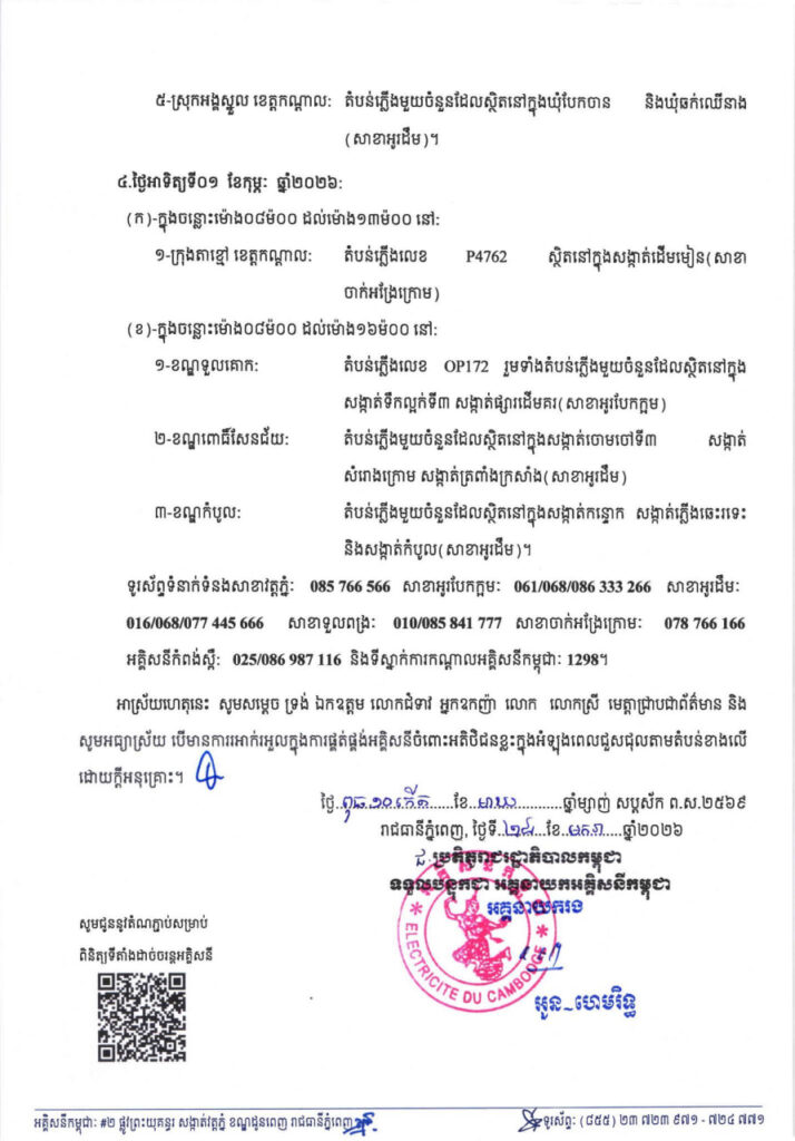 ភ្នំពេញ ៖ អគ្គិសនីកម្ពុជា (EDC) បានចេញសេចក្តីជូនដំណឹង ស្តីពីការអនុវត្តការងារជួសជុល ផ្លាស់ប្តូរដំឡើងបរិក្ខារនានា និងរុះរើគន្លងខ្សែ បណ្តាញអគ្គិសនី របស់អគ្គិសនីកម្ពុជា ដើម្បីបង្កលក្ខណៈងាយស្រួលដល់ការដ្ឋានពង្រីកផ្លូវ នៅថ្ងៃទី២៩ ខែមករា ឆ្នាំ២០២៦ ដល់ថ្ងៃទី០១ ខែកុម្ភៈ ឆ្នាំ២០២៦ នៅតំបន់មួយចំនួនទៅតាមពេលវេលា និងទីកន្លែងដូចសេចក្តីជូនដំណឹង លម្អិតខាងក្រោម ។