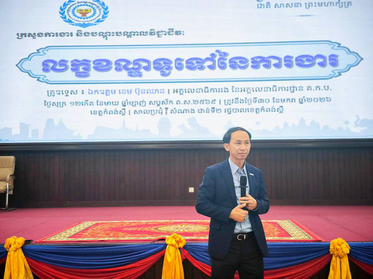 ខេត្តកំពង់ស្ពឺ ៖ នាព្រឹកថ្ងៃទី៣០ ខែមករា ឆ្នាំ២០២៦ លោក ទុយ ស៊ីផាន់ រដ្ឋលេខាធិការ តំណាងដ៏ខ្ពង់ខ្ពស់ លោក ហេង សួរ រដ្ឋមន្ត្រីក្រសួងការងារ និងបណ្តុះបណ្តាលវិជ្ជាជីវៈ និង លោក តូច ប៉ូលីវ៉ា អភិបាលរងនៃគណៈអភិបាលខេត្តកំពង់ស្ពឺ បានអញ្ជើញជាអធិបតី ក្នុងពិធីបើកវគ្គបណ្តុះបណ្តាលស្តីពី បទប្បញ្ញត្តិច្បាប់ស្តីពីការងារ ជូនដល់រដ្ឋបាល សហជីព និងប្រតិភូបុគ្គលិក មកពីបណ្តាសហគ្រាស គ្រឹះស្ថាន និងរោងចក្រនានា។