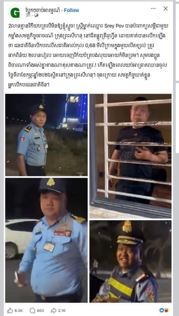 បើតាមការផ្សព្វផ្សាយ របស់ស្នងការខេត្តព្រះសីហនុ នៅយប់ថ្ងៃទី២ ខែកុម្ភៈ ឆ្នាំ២០២៦ កម្លាំងការិយាល័យ នគរបាលចរាចរណ៍ផ្លូវគោក បានដាក់គោលដៅត្រួត ជាតិអាកុល នៅលើផ្លូវ២៨មិថុនា ស្ថិតក្នុងសង្កាត់លេខ៣ ក្រុង-ខេត្តព្រះសីហនុ បានពិនិត្យណែនាំរថយន្ត និងម៉ូតូជាច្រើនគ្រឿង ពេលនោះបានពិនិត្យរថយន្តមួយគ្រឿងម៉ាក AlPHAND ពណ៌ខ្មៅ ពាក់ស្លាកលេខ ភ្នំពេញ 2BW-6130 បើកបរដោយបុរសជនជាតិចិនម្នាក់ ក្នុងស្ថានភាពស្រវឹងស្រា មានជាតិអាកុលក្នុងខ្លួន 0,68 ក្នុងមួយលីត្រខ្យល់ ហើយត្រូវបានសមត្ថកិច្ចឃាត់ឲ្យ នៅកន្លែងសិន ពេលស្វាង ទើបសមត្ថកិច្ចសម្របសម្រួលឲ្យទៅផ្ទះវិញ ។