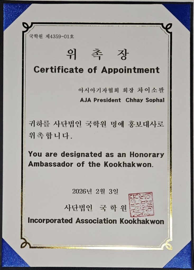 សេអ៊ូល៖ លោកបណ្ទិត ឆាយ សុផល រដ្ឋលេខាធិការក្រសួងព័ត៌មាន នៅសប្តាហ៍នេះ ត្រូវបានវិទ្យាស្ថាន Kookhakwon ឬ វិទ្យាស្ថានសិក្សាវប្បធម៌កូរ៉េពីបូរាណ (Institute for Traditional Korean Culture Studies) តែងតាំងជាឯកអគ្គរដ្ឋទូតកិត្តិយសម្រាប់វិទ្យាស្ថាននេះ។