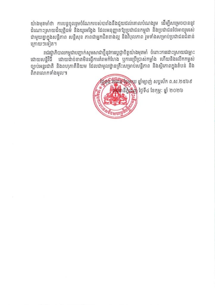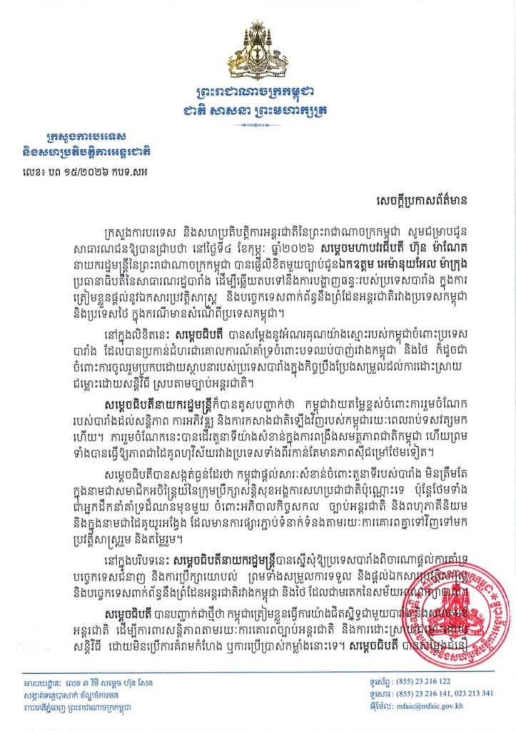 ភ្នំពេញ ៖ ក្រសួងការបរទេស និង សហប្រតិបត្តិការអន្តរជាតិ បានជ្រាបថា នៅថ្ងៃទី៤ ខែកុម្ភៈ ឆ្នាំ២០២៦ សម្តេចមហាបវរធិបតី ហ៊ុន ម៉ាណែត នាយករដ្ឋមន្ត្រី នៃព្រះរាជាណាចក្រកម្ពុជា បានផ្ញើលិខិតមួយច្បាប់ជូនលោក អេម៉ានុយអែល ម៉ាក្រុង ប្រធានាធិបតី នៃសាធារណរដ្ឋបារាំង ដើម្បីឆ្លើយតបទៅ នឹងការបង្ហាញឆន្ទៈរបស់ប្រទេសបារាំង ក្នុងការ ត្រៀមខ្លួនផ្តល់នូវឯកសារប្រវត្តិសាស្ត្រ និងបច្ចេកទេសពាក់ព័ន្ធ នឹងព្រំដែនអន្តរជាតិ រវាងប្រទេសកម្ពុជា និងប្រទេសថៃ ក្នុងករណីមានសំណើ ពីប្រទេសកម្ពុជា ។