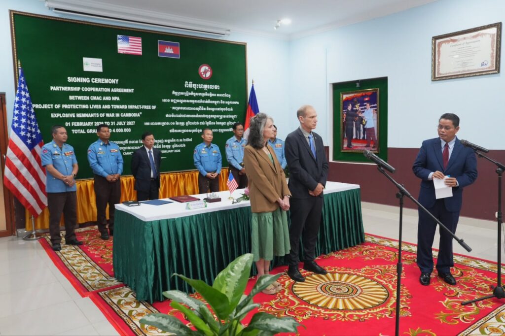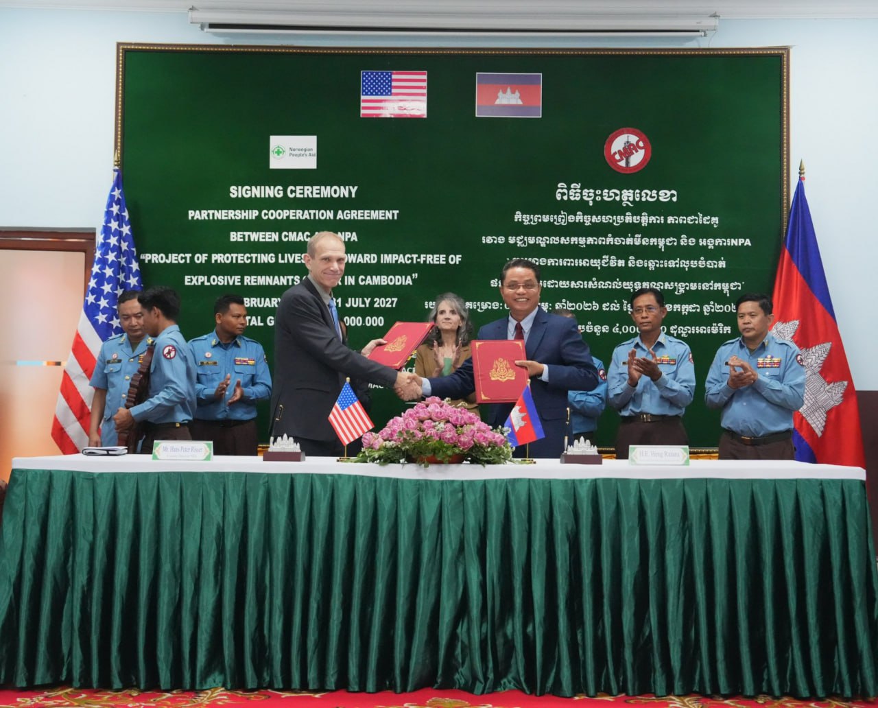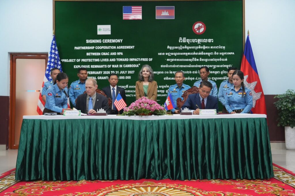 ភ្នំពេញ៖ លោក ហេង រតនា អគ្គនាយកស៊ីម៉ាក់ និងលោក Hans Peter Risser ប្រធានអង្គការ NPA ដោយមានការអញ្ជើញចូលរួមជាសាក្សីពីសំណាក់លោកស្រី Kelly Saltzman សហការីផ្នែកនយោបាយ នៃស្ថានទូតសហរដ្ឋអាម៉េរិកប្រចាំនៅកម្ពុជា នារសៀលថ្ងៃទី៥ ខែកុម្ភៈ ឆ្នាំ២០២៦នេះ បានចុះហត្ថលេខាលើកិច្ចព្រមព្រៀងកិច្ចសហប្រតិបត្តិការភាពជាដៃគូរវាង មជ្ឈមណ្ឌលសកម្មភាពកំចាត់មីនកម្ពុជា និងអង្គការ NPA ក្រោមគម្រោង “ ការពារអាយុជីវិត និងឆ្ពោះទៅលុបបំបាត់ផលប៉ះពាល់ដោយសារសំណល់យុទ្ធភណ្ឌសង្គ្រាមនៅកម្ពុជា ” តាមរយៈការអនុវត្តគម្រោងកម្មវិធីការស្រាវជ្រាវ និងបោសសម្អាតគ្រាប់បែកចង្កោម ការបោសសម្អាតមីន និងការដោះស្រាយការគំរាមកំហែងដែលនៅសេសសល់ សម្រាប់រយៈពេល១៨ខែ ចាប់ពីថ្ងៃទី០១ ខែកុម្ភៈ ឆ្នាំ២០២៦ ដល់ថ្ងៃទី៣១ ខែកក្កដា ឆ្នាំ២០២៧ ដែលមានថវិកាគាំទ្រគម្រោងសរុបចំនួន ៥.០០០.០០០ដុល្លារអាម៉េរិក ដែលក្នុងនោះអង្គភាព CMAC បានទទួលថវិកាចំនួន ៤.០០០.០០០ដុល្លារអាម៉េរិក តាមរយៈអង្គការ NPA និងអង្គការ NPA បានទទួលថវិកាចំនួន ១.០០០.០០០ដុលា្លរអាម៉េរិក។