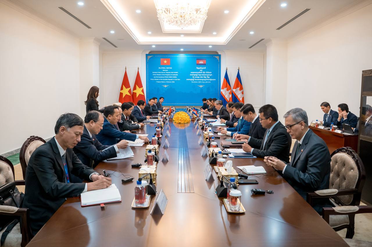 ភ្នំពេញ ៖ នៅថ្ងៃទី០៦ ខែកុម្ភៈ ឆ្នាំ២០២៦, សម្តេចមហាបវរធិបតី ហ៊ុន ម៉ាណែត នាយករដ្ឋមន្រ្តី នៃកម្ពុជា បានទទួលជួបពិភាក្សាការងារជាមួយ លោក ផាម មិញជិញ (PHAM Minh Chinh) នាយករដ្ឋមន្ត្រីវៀតណាម ខណ:កម្ពុជា-វៀតណាម ប្ដេជ្ញាជំរុញកំណើន ទំហំពាណិជ្ជកម្មទ្វេទិស ឱ្យដល់គោលដៅ ២០ពាន់លានដុល្លារ។