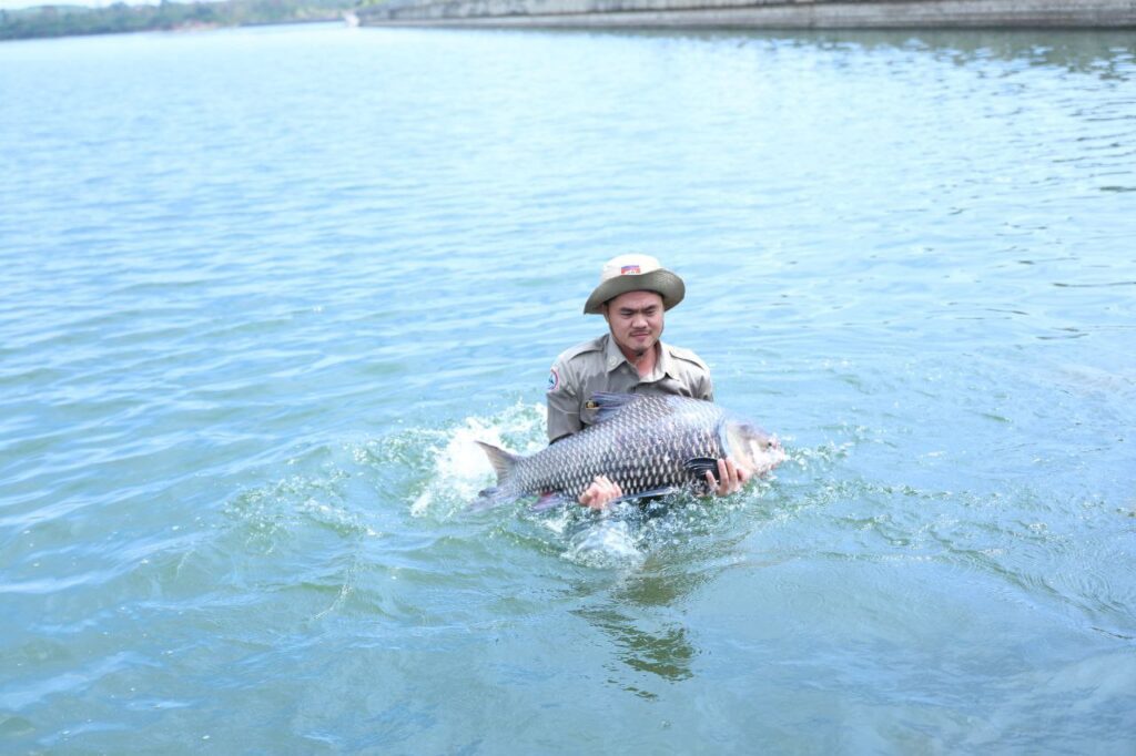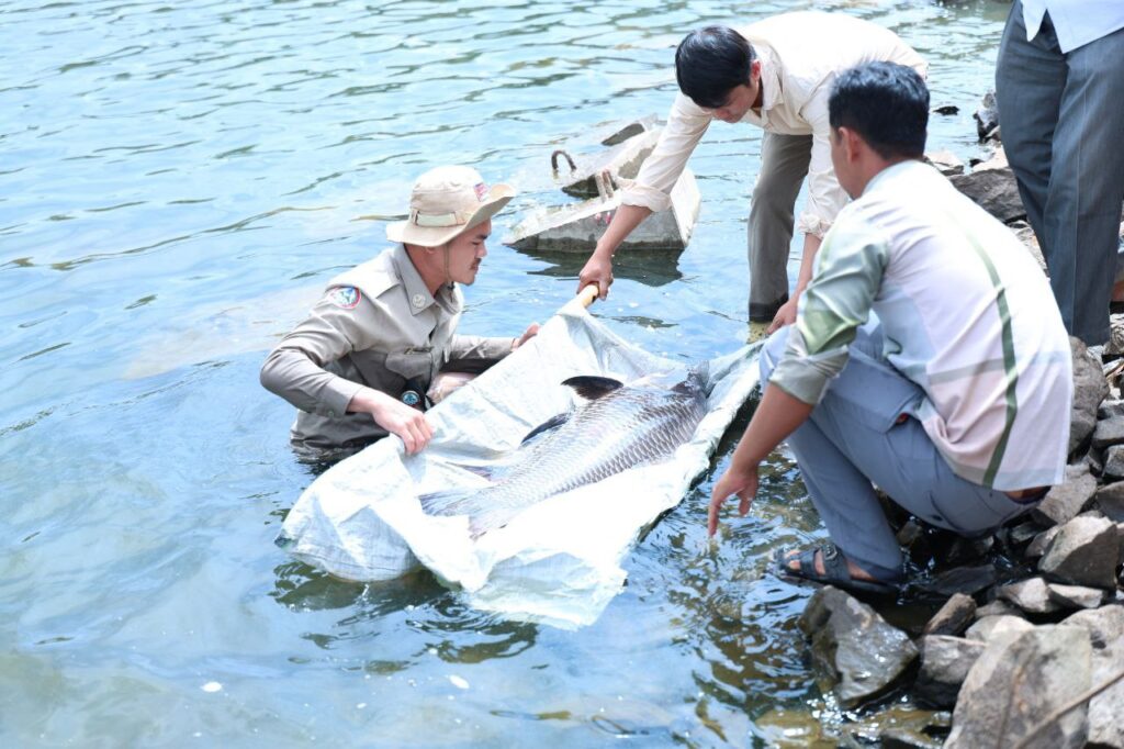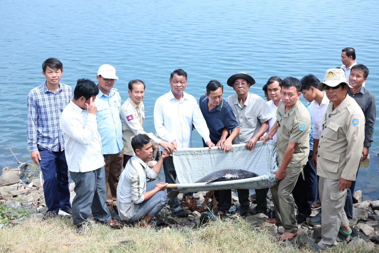 ត្រីគល់រាំងចំនួន ២ក្បាល ដែលប្រជាពលរដ្ឋនេសាទបាននៅអាងទឹកជាំតាហ៊ឹង ត្រូវបានអាជ្ញាធរ និងមន្ត្រីជំនាញជួយសង្គ្រោះ នាំយកទៅលែងចូលក្នុងទន្លេសប្បនិមិត្តខេត្តត្បូងឃ្មុំ