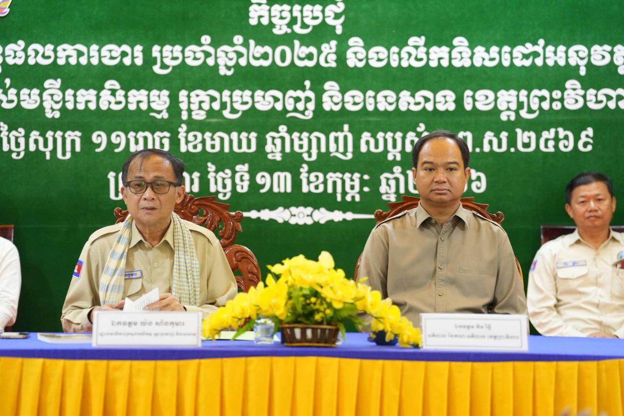 ព្រះវិហារ៖ នាថ្ងៃទី១៣ ខែកុម្ភៈ ឆ្នាំ២០២៦ លោកយ៉ង សាំងកុមារ រដ្ឋលេខាធិការក្រសួងកសិកម្ម និងលោក គីម រិទ្ធី អភិបាលខេត្តព្រះវិហារ និងមន្រ្តីរាជការជាច្រើននាក់ របស់មន្ទីរកសិកម្ម រុក្ខាប្រមាញ់ និងនេសាទ ខេត្តព្រះវិហារ បានបើកកិច្ចប្រជុំបូកសរុបលទ្ធផលការងារប្រចាំឆ្នាំ២០២៥ និងលើកទិសដៅអនុវត្តន៍ឆ្នាំ២០២៦ នៅសាលប្រជុំមន្ទីរកសិកម្ម រុក្ខាប្រមាញ់ និងនេសាទ ខេត្តព្រះវិហារ។