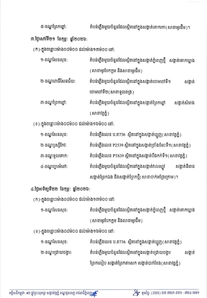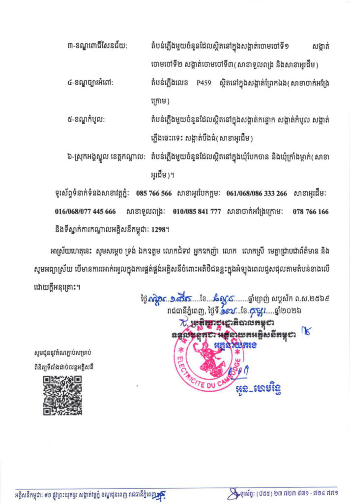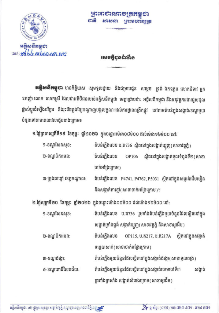EDC ជូនដំណឹងពីការរអាក់រអួលចរន្ត តាមតំបន់សង្កាត់ ខណ្ឌ មួយចំនួនចាប់ពីថ្ងៃនេះ ដល់ថ្ងៃទី២២ ខែកុម្ភៈ ឆ្នាំ២០២៦ ដើម្បីរុះរើគន្លងខ្សែបណ្តាញ ផ្លាស់ប្តូរ តម្លើងបរិក្ខារ ងាយស្រួលដល់ការដ្ឋានពង្រីកផ្លូវ