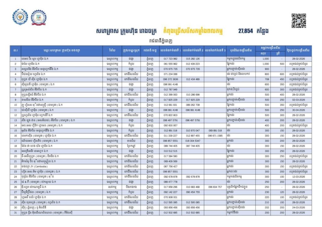តាមរយៈការផ្សព្វផ្សាយ ក្រសួងការងារ បានឱ្យដឹងថា គិតត្រឹមថ្ងៃទី២០ ខែកុម្ភៈ ឆ្នាំ២០២៦នេះ នៅរាជធានីភ្នំពេញ មានឱកាសការងារសរុបចំនួន ២៧,៨៥៤កន្លែង កំពុងរង់ចាំបងប្អូនអតីតពលករត្រឡប់មកពីប្រទេសថៃ និងអ្នកកំពុងស្វែងរកការងារធ្វើ។ ឱកាសការងារទាំងនោះ ស្ថិតក្នុងវិស័យឧស្សាហកម្ម វិស័យសេវាកម្ម។