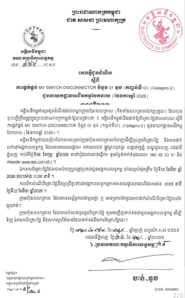 ភ្នំពេញ ៖ អគ្គិសនីកម្ពុជា សូមជូនដំណឹងដល់បណ្តាក្រុមហ៊ុន/សហគ្រាស (គិតទាំងសហគ្រាសឯកត្តបុគ្គល) ដែលបានចុះបញ្ជីត្រឹមត្រូវ ក្នុងព្រះរាជាណាចក្រកម្ពុជា ឱ្យបានជ្រាបថា ៖ អគ្គិសនីកម្ពុជា នឹងដាក់ឱ្យពិគ្រោះថ្លៃ ជាសាធារណៈស្តីពី ការផ្គត់ផ្គង់ MV SWITCH DISCONNECTOR ចំនួន 01 មុខ (កញ្ចប់ទី10) (Category-2) ជូននាយកដ្ឋានអាជីវកម្ម ចែកចាយ (ផែនការឆ្នាំ 2026) ។