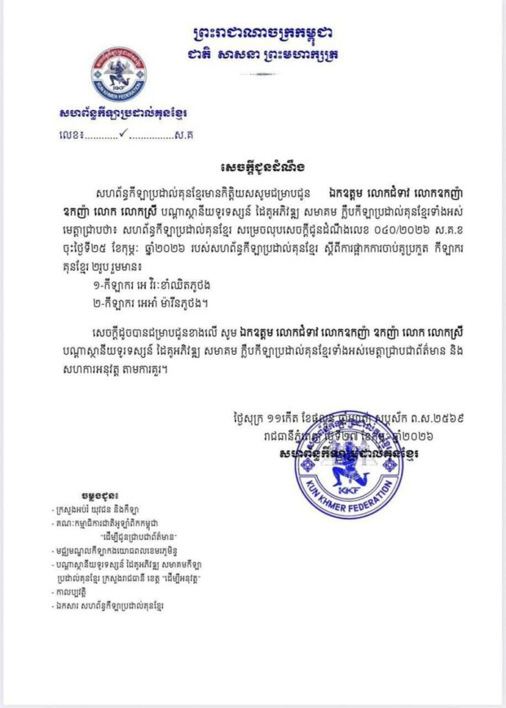 សហព័ន្ធកីឡាប្រដាល់គុនខ្មែរ លុបទណ្ឌកម្មលើកូនៗរបស់លោក អេ ភូថង