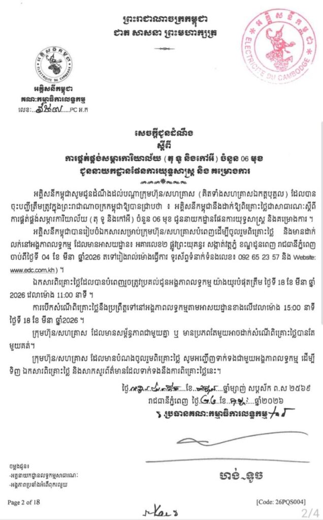 អគ្គិសនីកម្ពុជា បានរៀបចំឯកសារសម្រាប់ក្រុមហ៊ុន/សហគ្រាសបំពេញដើម្បីចូលរួមពិគ្រោះថ្លៃ និងមានដាក់ លក់នៅអង្គភាពលទ្ធកម្ម ដែលមានអាសយដ្ឋាន៖ អគារលេខ២ ផ្លូវព្រះយុគន្ធរ សង្កាត់វត្តភ្នំ ខណ្ឌដូនពេញ រាជធានីភ្នំពេញ ចាប់ពីថ្ងៃទី 04 ខែ មីនា ឆ្នាំ2026 តទៅរៀងរាល់ម៉ោងធ្វើការ ទូរស័ព្ទទំនាក់ទំនងលេខ៖ 092 65 23 57 និង Website: www.edc.com.kh)។