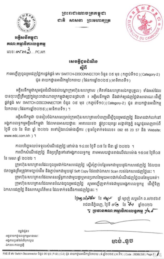 ភ្នំពេញ ៖ អគ្គិសនីកម្ពុជា សូមជូនដំណឹងដល់បណ្តាក្រុមហ៊ុន/សហគ្រាស (គិតទាំងសហគ្រាសឯកត្តបុគ្គល) ទាំងអស់ ដែលបានចុះបញ្ជីត្រឹមត្រូវ ក្នុងព្រះរាជាណាចក្រកម្ពុជា ឲ្យបានជ្រាបថា៖ អគ្គិសនីកម្ពុជា នឹងដាក់ឲ្យដេញថ្លៃ ជាសាធារណៈដើម្បី ផ្គត់ផ្គង់ MV SWITCH-DISCONNECTOR ចំនួន ០៥ មុខ (កញ្ចប់ទី១០) (Category-2) ជូន នាយកដ្ឋានអាជីវកម្ម ចែកចាយ (ផែនការឆ្នាំ២០២៥) (អាទិភាពទី១) ។
