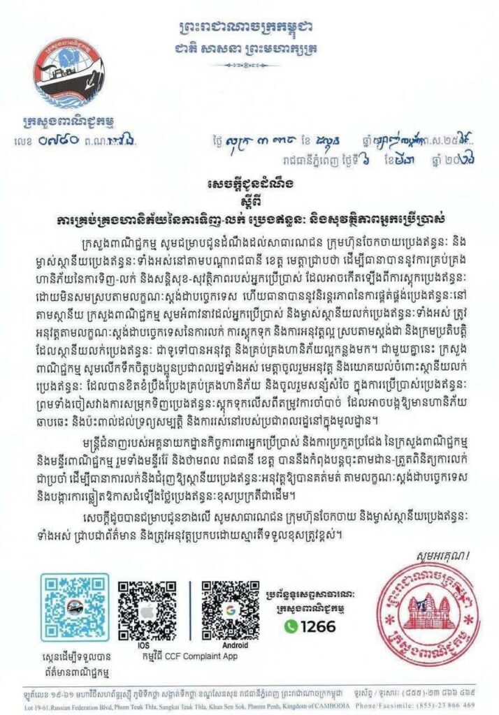 អាជ្ញាធរបានបញ្ជាក់ថា ប្រសិនបើមានអាជីវករណាមួយលក់ប្រេងឥន្ធនៈលើសពីតម្លៃដែលក្រសួងបានកំណត់ នឹងត្រូវទទួលរងវិធានការតាមច្បាប់ និងការផាកពិន័យជាធរមាន។