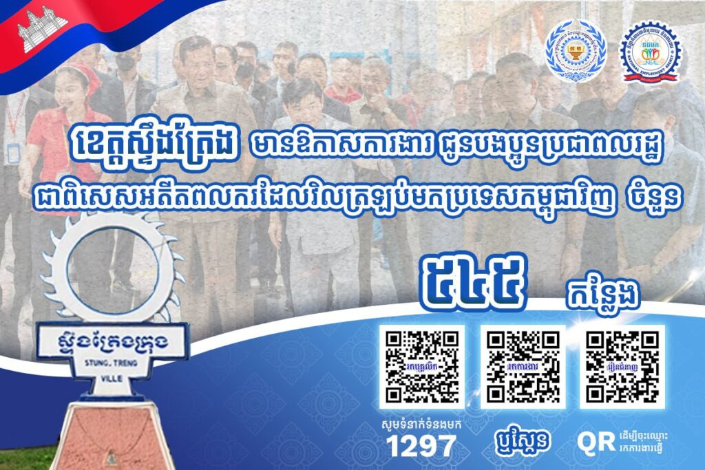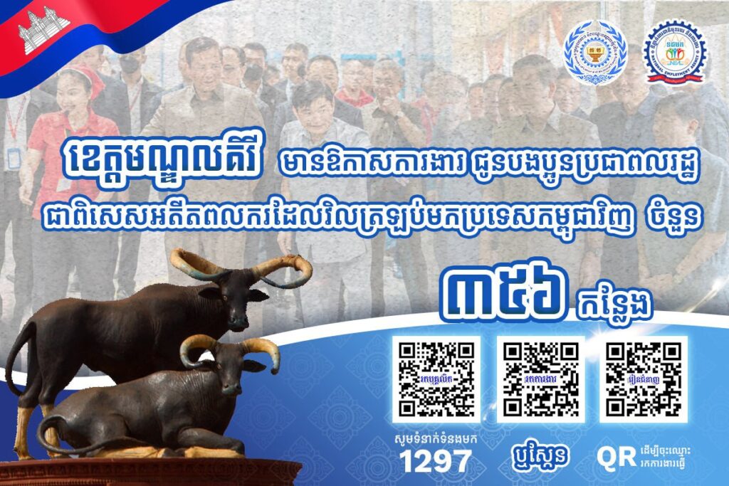សេចក្ដីជូនដំណឹងរបស់ក្រសួងការងារ បានឱ្យដឹងថា គិតត្រឹមថ្ងៃទី០៦ ខែមីនា ឆ្នាំ២០២៦នេះ ខេត្តដែលស្ថិតនៅភូមិភាគឦសាន្ត រួមមាន ខេត្តក្រចេះ ស្ទឹងត្រែង រតនគិរី និងខេត្តមណ្ឌលគិរី មានឱកាសការងារសរុបចំនួន ៣ ៤៧៧កន្លែង កំពុងរង់ចាំបងប្អូនអតីតពលករត្រឡប់មកពីប្រទេសថៃ និងអ្នកកំពុងស្វែងរកការងារធ្វើក្នុងវិស័យកសិកម្ម ឧស្សាហកម្ម និងវិស័យសេវាកម្ម។