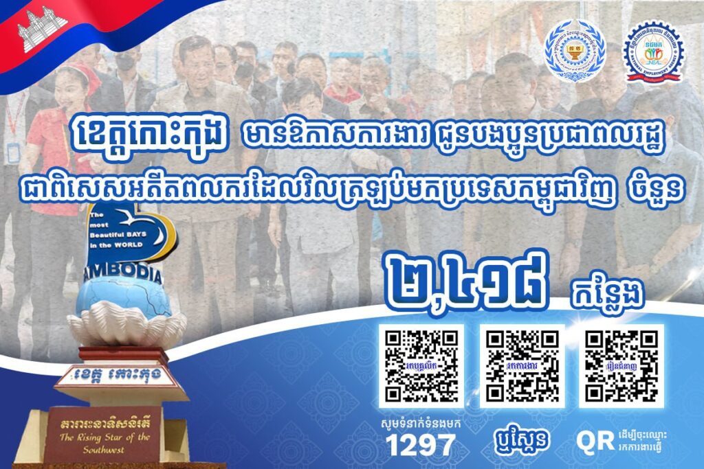 តាមរយៈការផ្សព្វផ្សាយ ក្រសួងការងារ បានឱ្យដឹងថា គិតត្រឹមថ្ងៃទី១៤ ខែមីនា ឆ្នាំ២០២៦នេះ ខេត្តព្រះសីហនុ កំពត កោះកុង និងខេត្តកែប មានឱកាសការងារសរុបចំនួន ៤,០៩០កន្លែង កំពុងរង់ចាំបងប្អូនអតីតពលករ ត្រឡប់មកពីប្រទេសថៃ និងអ្នកកំពុងស្វែងរកការងារធ្វើនៅក្នុងវិស័យឧស្សាហកម្ម និងវិស័យសេវាកម្ម។