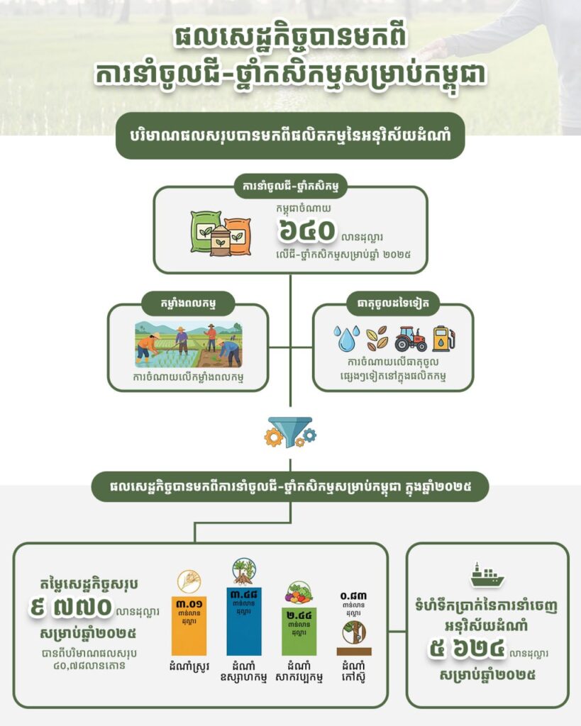 ការលើកឡើង របស់អ្នកនាំពាក្យ ក្រសួងកសិកម្មនេះ បន្ទាប់ពីមានការចុះផ្សាយព័ត៌មានថា កម្ពុជា បាននាំចូលជីនិងថ្នាំកសិកម្ម ក្នុងទំហំទឹកប្រាក់ ៦៣៦លានដុល្លារ ក្នុងឆ្នាំ២០២៥ ដែលបានធ្វើឱ្យសាធារណៈជនមួយចំនួន មានការភ្ញាក់ផ្អើលចំពោះតួលេខនេះ។