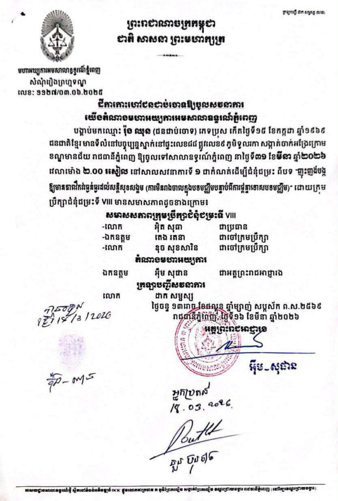 ភ្នំពេញ៖ មហាអយ្យការអមសាលាឧទ្ធរណ៍ភ្នំពេញ បានចេញដីកាកោះហៅ បង្គាប់ឱ្យ លោក រ៉ុង ឈុន ចូលទៅសាលាឧទ្ធរណ៍ភ្នំពេញ នាថ្ងៃទី៣១ ខែមីនា ឆ្នាំ២០២៦ វេលាម៉ោង ២.០០ រសៀល នៅសាលសវនាការទី ១ ជាកំណត់ដើម្បីជំនុំជម្រះ ពីបទ “ញុះញង់បង្ក ឱ្យមានភាពវឹកវរធ្ងន់ធ្ងរដល់សន្តិសុខសង្គម (ការមិនរាងចាលក្នុងបទមជ្ឈិមបន្ទាប់ពីការផ្ដន្ទាទោសបទមជ្ឈិម)” ។