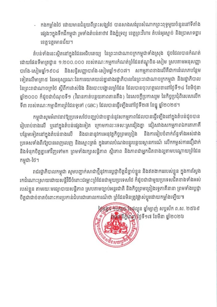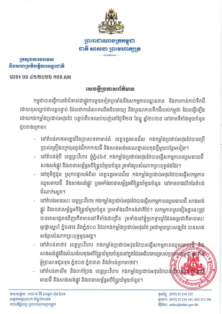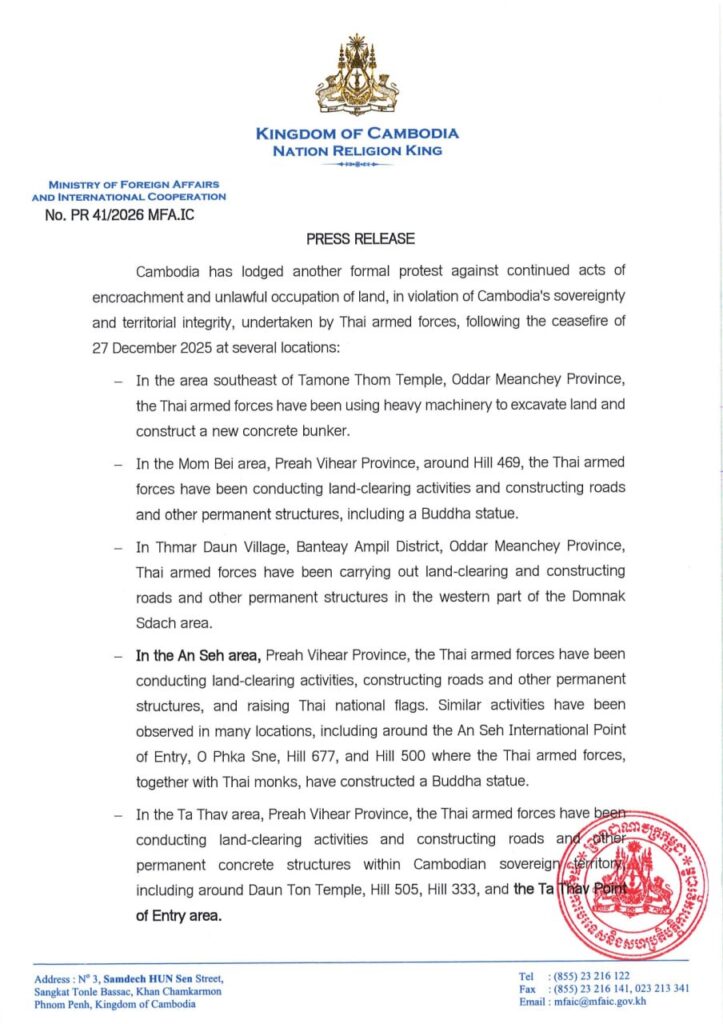 ភ្នំពេញ ៖ កម្ពុជា បានធ្វើការតវ៉ាជំទាស់ជាផ្លូវការមួយទៀតប្រឆាំងនឹងសកម្មភាពឈ្លានពាន និងការកាន់កាប់ទឹកដី ដោយខុសច្បាប់ជាបន្តបន្ទាប់ ដែលជាការរំលោភលើអធិបតេយ្យ និងបូរណភាពទឹកដីរបស់កម្ពុជា ដែលធ្វើឡើង ដោយកងកម្លាំងប្រដាប់អាវុធថៃ បន្ទាប់ពីបទឈប់បាញ់ នៅថ្ងៃទី២៧ ខែធ្នូ ឆ្នាំ២០២៥ នៅតាមទីតាំងមួយចំនួន។