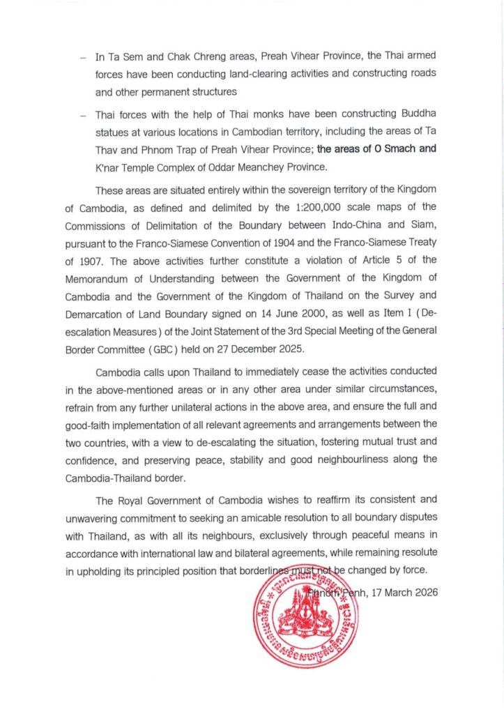 កម្ពុជា តវ៉ាជំទាស់ជាផ្លូវការមួយទៀត ប្រឆាំងនឹងសកម្មភាពឈ្លានពាន និងកាន់កាប់ទឹកដី ដោយខុសច្បាប់ជាបន្តបន្ទាប់របស់ភាគីថៃ