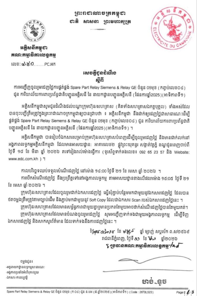 អគ្គិសនីកម្ពុជា បានរៀបចំឯកសារសម្រាប់ក្រុមហ៊ុន/សហគ្រាសបំពេញ ដើម្បីចូលរួមដេញថ្លៃ និងមានដាក់លក់នៅ អង្គភាពលទ្ធកម្មអគ្គិសនីកម្ពុជា ដែលមានអាសយដ្ឋាន: អាគារលេខ២ ផ្លូវព្រះយុគន្ធរ សង្កាត់វត្តភ្នំ ខណ្ឌដូនពេញចាប់ពី ថ្ងៃទី ១៨ ខែ មីនា ឆ្នាំ ២០២៦ តទៅរៀងរាល់ម៉ោងធ្វើការ (ទូរស័ព្ទទាក់ទងលេខ៖ 092 65 23 57 និង Website: www.edc.com.kh) ។