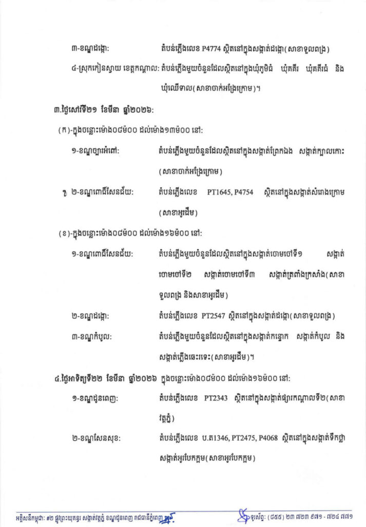 EDC ជូនដំណឹងពីការរអាក់រអួលចរន្ត តាមតំបន់សង្កាត់ ខណ្ឌ មួយចំនួនចាប់ពីថ្ងៃនេះ ដល់ថ្ងៃទី២២ ខែមីនា ឆ្នាំ២០២៦ ដើម្បីរុះរើគន្លងខ្សែបណ្តាញ ផ្លាស់ប្តូរ តម្លើងបរិក្ខារ ងាយស្រួលដល់ការដ្ឋានពង្រីកផ្លូវ