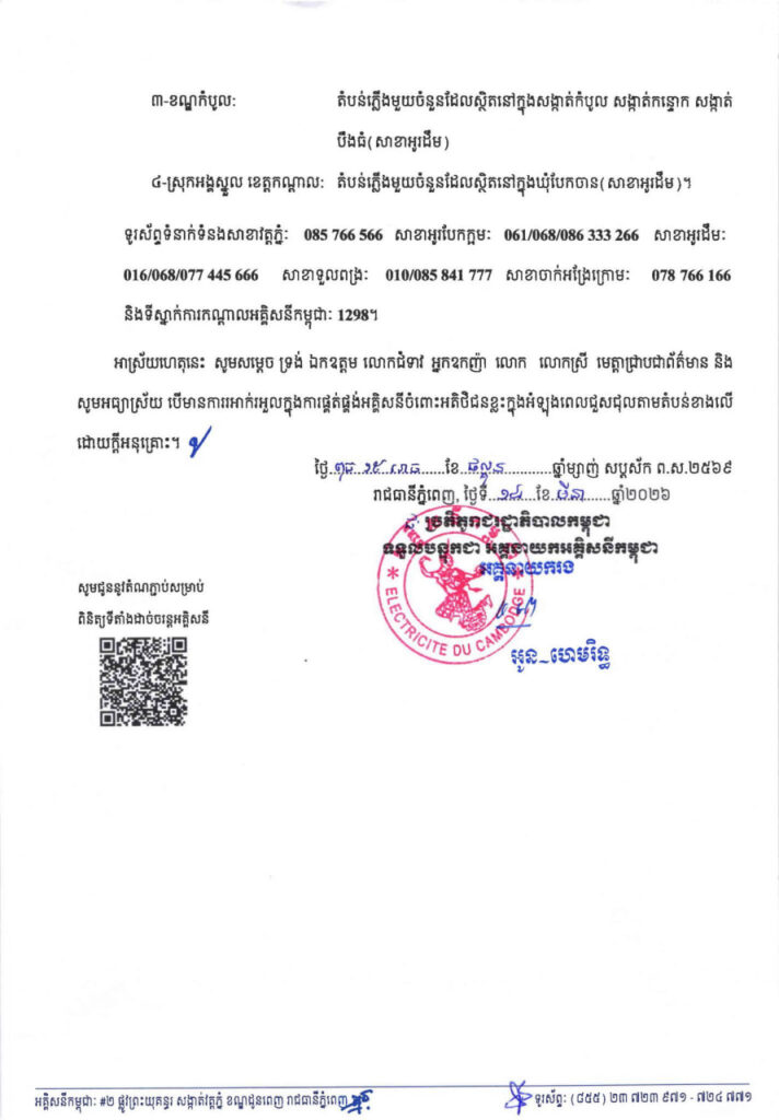 សូមអានសេចក្តីជូនដំណឹង របស់អគ្គិសនីកម្ពុជា ដូចខាងក្រោម ៖