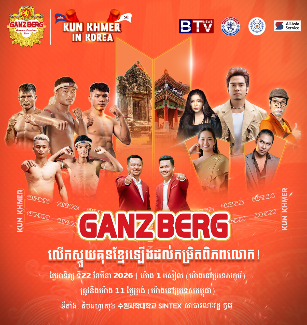 ព្រឹត្តិការណ៍នេះ ផ្ដួចផ្ដើមរៀបចំដោយក្រុមហ៊ុនស្រាបៀ GANZBERG, សហព័ន្ធកីឡាប្រដាល់គុនខ្មែរ, ស្ថានីយ​ទូរ​ទស្សន៍បាយ័ន និងក្រសួងការងារ និងបណ្តុះ​បណ្តាល​វិជ្ជា​ជីវៈ គ្រោងផ្សាយផ្ទាល់តាមរយៈទូរទស្សន៍ BTV News ពី​ប្រទេ​សកូរ៉េ មក​កាន់កម្ពុជាវេលាម៉ោង ១រសៀល​(ម៉ោង​នៅ​កូរ៉េ) ត្រូវ​នឹង​ម៉ោង​១១ ថ្ងៃត្រង់​ម៉ោង​នៅប្រ​ទេស​កម្ពុជា។