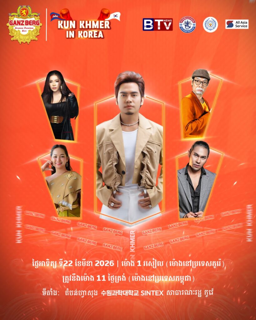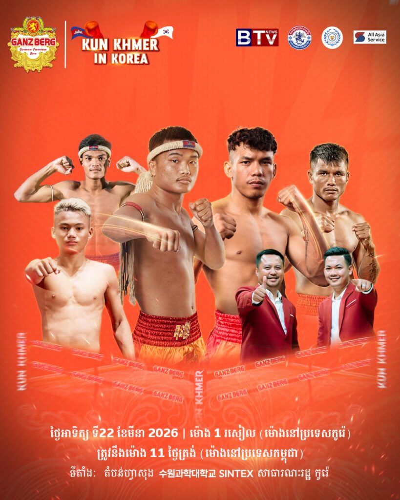កូរ៉េខាងត្បូង៖ ព្រឹត្តិការណ៍គុនខ្មែរ និងការសម្តែង​សិល្បៈ​ដ៏ធំនៅសា​ធារណរដ្ឋកូរ៉េ នឹងរៀបចំ​នៅថ្ងៃ​អាទិត្យ ទី២២ ខែមីនា ឆ្នាំ២០២៦ ដើម្បីផ្តល់​ភាពរីក​រាយ​ជូន​ដល់ប្រជាពលករ និង​សហគមន៍​ខ្មែរឱ្យ​សប្បាយ​រីក​រាយ និងលើកកម្ពស់​ការគាំទ្រ​វិស័យកីឡា​ប្រដាល់​គុនខ្មែរ​ កាន់​តែខ្លាំងនៅតំបន់ហ្វាសង់ មហាវិទ្យាល័យ​វិទ្យា​សាស្ត្រ​ស៊ូវ៉ុន(SUNWON SCIENCE COLLEGE SINTEX)។