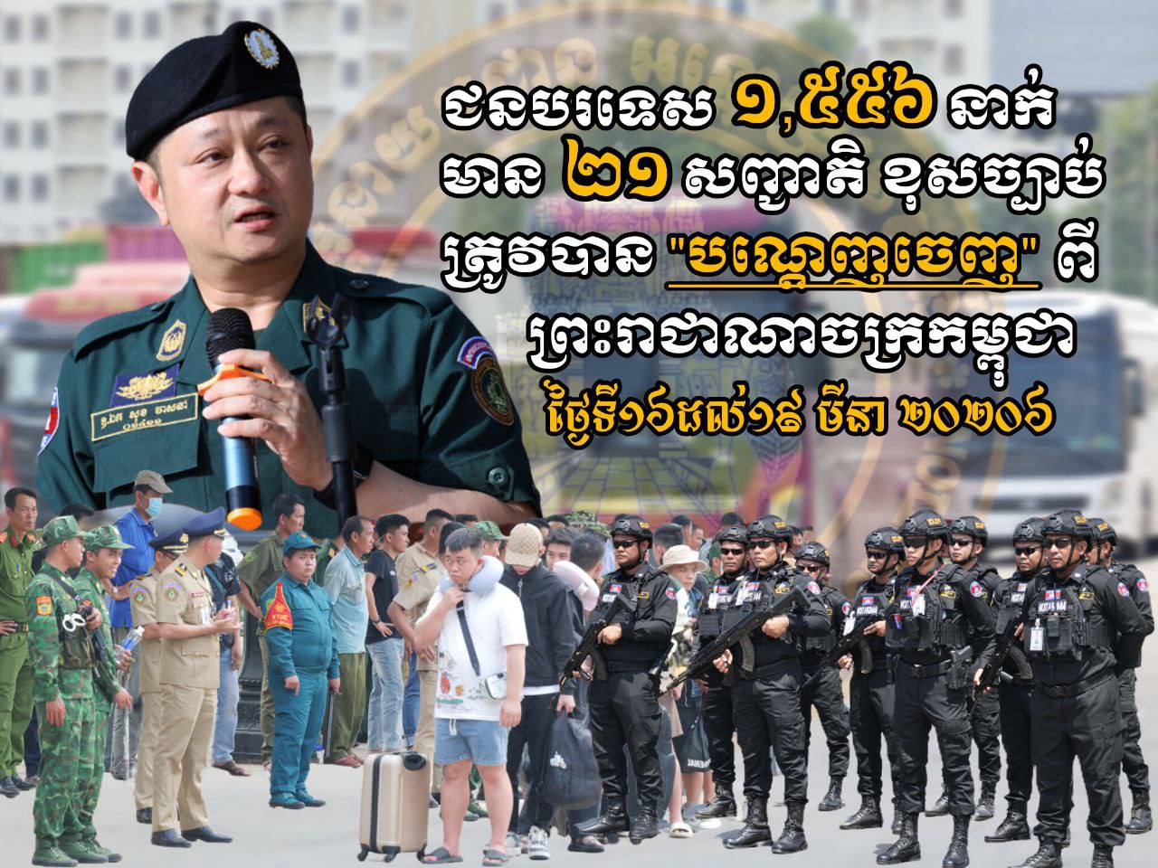 ភ្នំពេញ ៖ រយៈពេល៤ថ្ងៃចាប់ពីថ្ងៃទី១៦ដល់១៩ ខែមីនា ឆ្នាំ២០២៦ នាយកដ្ឋានស៊ើបអង្កេត និងអនុវត្តនីតិវិធី នៃអគ្គនាយកដ្ឋានអន្តោប្រវេសន៍ បានបណ្ដេញចេញជនបរទេសសរុបចំនួន ១,៥៥៦នាក់ ស្រី២៧៨នាក់ មាន២១សញ្ជាតិចេញពីកម្ពុជា ។