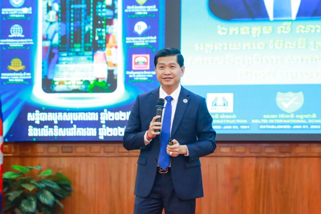 លោក លី ប៊ុនឆៃ អគ្គនាយករង ប៊ែលធី គ្រុប និងជាប្រធានគណៈគ្រប់គ្រងនាយកសាខាបានឱ្យដឹងថា ប៊ែលធី គ្រុប មានគណៈគ្រប់គ្រង បុគ្គលិក សាស្រ្តាចារ្យ លោកគ្រូ-អ្នកគ្រូបម្រើការ ៤,២៣៨នាក់ និងមាន ៣៧ទីតាំង (១ទីតាំង ជាស្នាក់ការកណ្តាល ប៊ែលធី គ្រុប ៣ទីតាំងជាសាកលវិទ្យាល័យ និង ៣៣ទីតាំងជាសាលា)។ ឯកឧត្តម បានជម្រាបជូនអំពីសមិទ្ធផលសម្រេចបានក្នុងឆ្នាំ២០២៥ រួមមាន ១-ប៊ែលធីសំណង់ ២-ប៊ែលធីទេសចរណ៍ ៣-សាលា ប៊ែលធី អន្តរជាតិ ៤-សាកលវិទ្យាល័យ ប៊ែលធី អន្តរជាតិ ៥-ប៊ែលធី ទំនាក់ទំនងអន្តរជាតិ ៦-មជ្ឈមណ្ឌលតេស្តអន្តរជាតិ ៧-ប៊ែលធីស្រាវជ្រាវ និងបោះពុម្ព (BELTEI University Press) និង ៨-មូលនិធិសប្បុរសធម៌ ប៊ែលធី ។