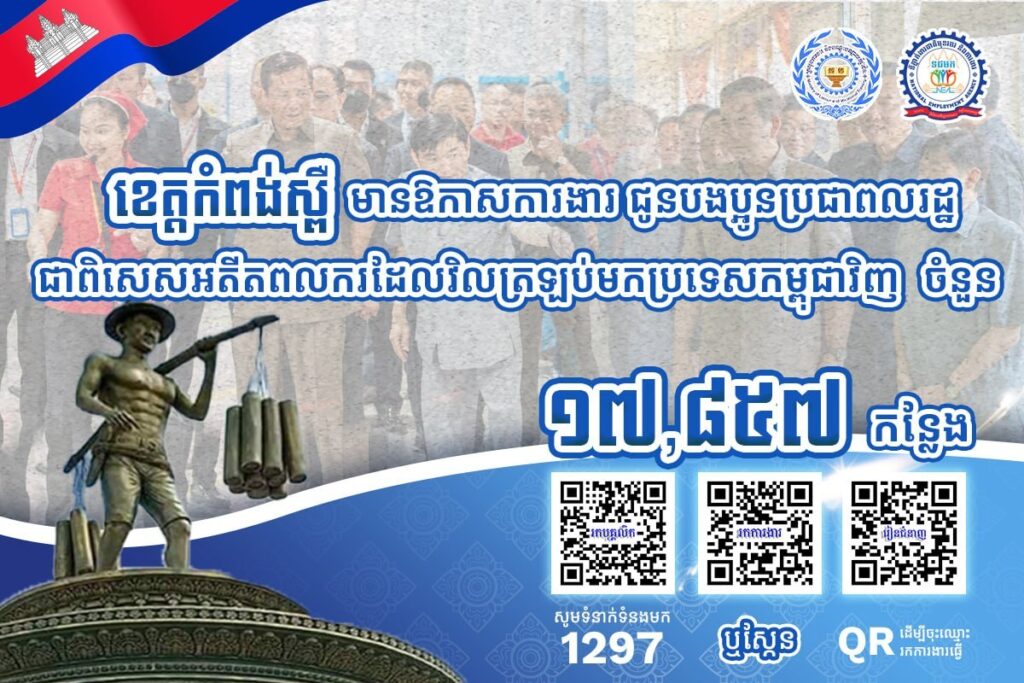 តាមរយៈការផ្សព្វផ្សាយ ក្រសួងការងារបានឱ្យដឹងថា គិតត្រឹមថ្ងៃទី២១ ខែមីនា ឆ្នាំ២០២៦នេះ ខេត្តកំពង់ស្ពឺមានឱកាសការងារចំនួន ១៧,៨៥៧កន្លែង កំពុងរង់ចាំបងប្អូនអតីតពលករត្រឡប់មកពីប្រទេសថៃ និងអ្នកកំពុងស្វែងរកការងារធ្វើ។ ឱកាសការងារទាំងនោះស្ថិតក្នុងវិស័យឧស្សាហកម្ម និងសេវាកម្ម។