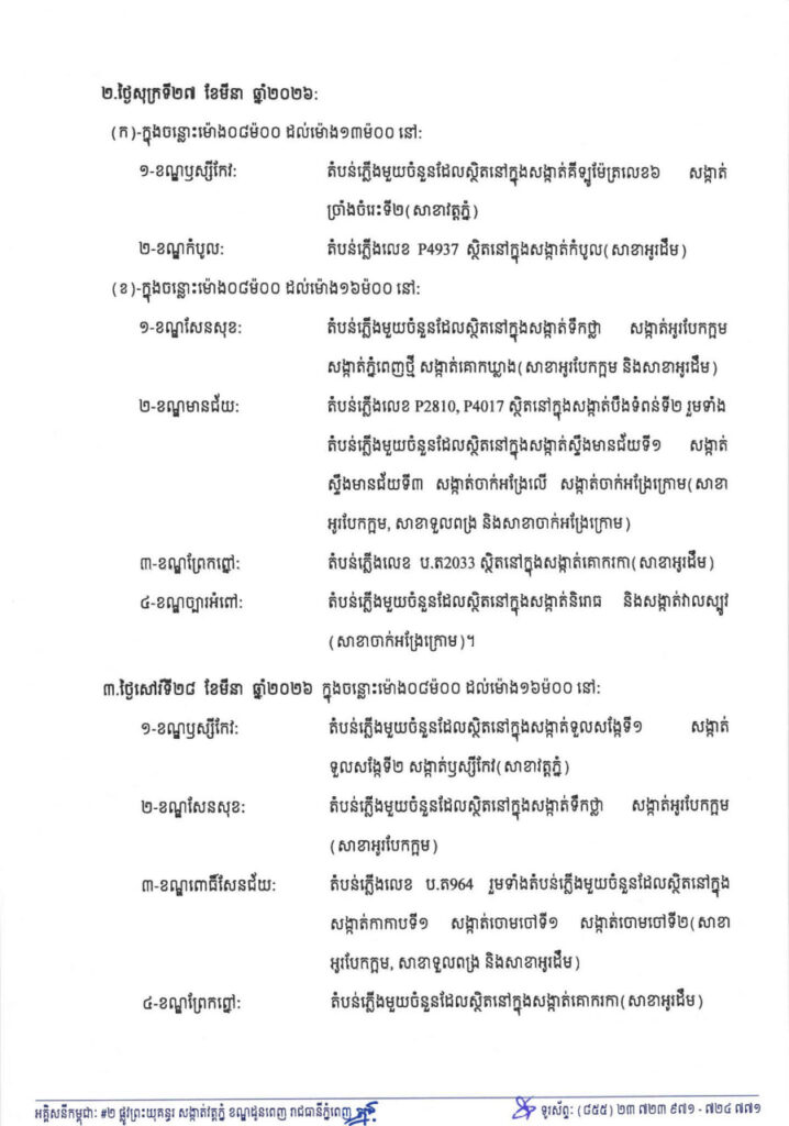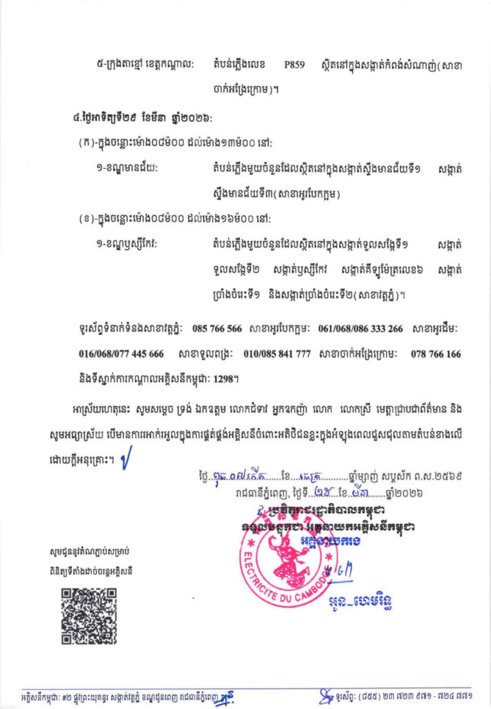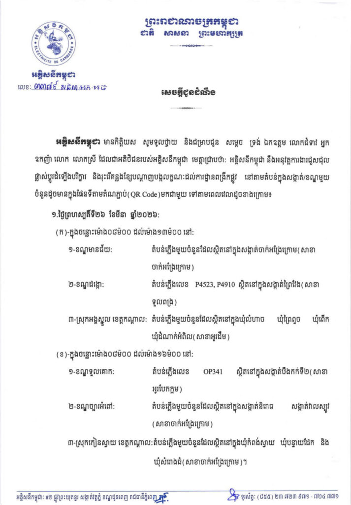 EDC ជូនដំណឹងពីការរអាក់រអួលចរន្ត តាមតំបន់សង្កាត់ ខណ្ឌ មួយចំនួនចាប់ពីថ្ងៃនេះ ដល់ថ្ងៃទី២៩ ខែមីនា ឆ្នាំ២០២៦ ដើម្បីរុះរើគន្លងខ្សែបណ្តាញ ផ្លាស់ប្តូរ តម្លើង បរិក្ខារ ងាយស្រួលដល់ការដ្ឋានពង្រីកផ្លូវ