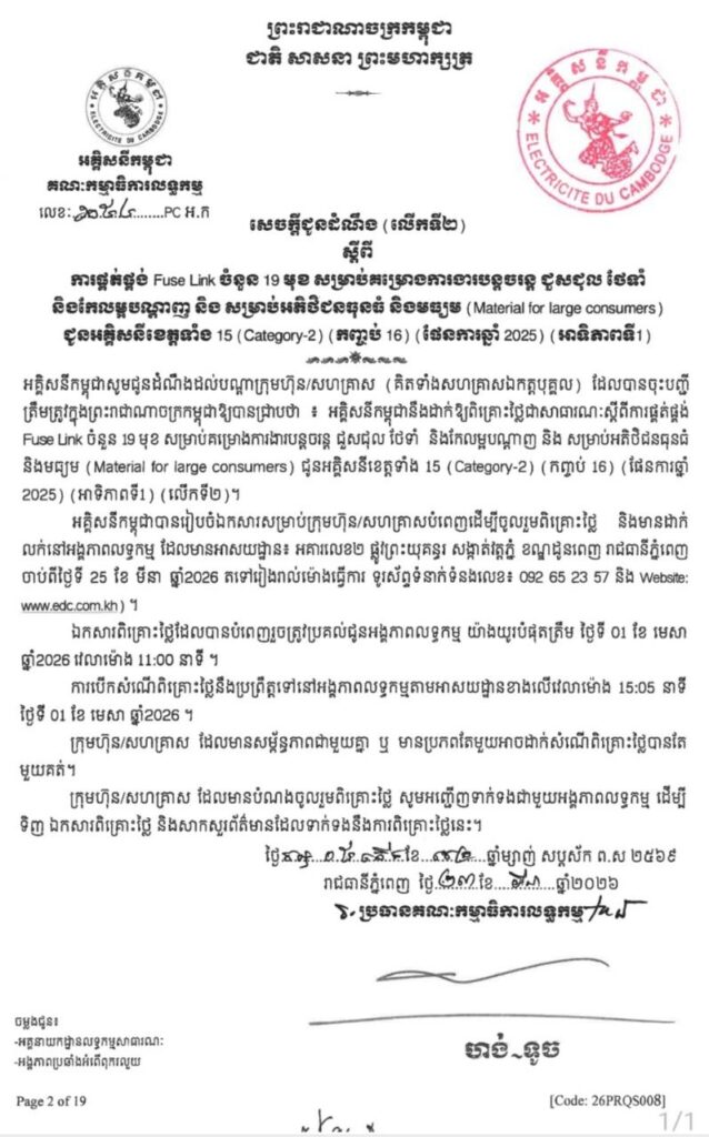 អគ្គិសនីកម្ពុជា បានរៀបចំឯកសារ សម្រាប់ក្រុមហ៊ុន/សហគ្រាសបំពេញ ដើម្បីចូលរួមពិគ្រោះថ្លៃ និងមានដាក់ លក់នៅអង្គភាព លទ្ធកម្ម ដែលមានអាសយដ្ឋាន៖ អគារលេខ២ ផ្លូវព្រះយុគន្ធរ សង្កាត់វត្តភ្នំ ខណ្ឌដូនពេញ រាជធានីភ្នំពេញ ចាប់ពីថ្ងៃទី 25 ខែ មីនា ឆ្នាំ2026 តទៅរៀងរាល់ម៉ោងធ្វើការ ទូរស័ព្ទទំនាក់ទំនងលេខ៖ 092 65 23 57 និង Website: www.edc.com.kh)។
