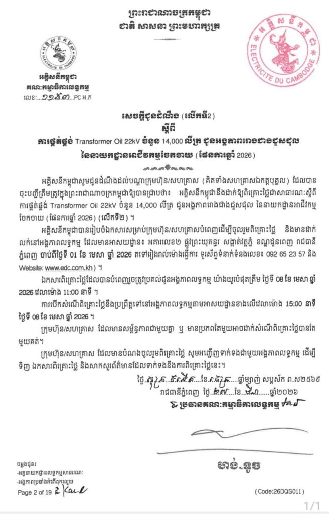 ភ្នំពេញ ៖ អគ្គិសនីកម្ពុជា សូមជូនដំណឹងដល់បណ្តាក្រុមហ៊ុន/សហគ្រាស (គិតទាំងសហគ្រាសឯកត្តបុគ្គល) ដែលបាន ចុះបញ្ជីត្រឹមត្រូវ ក្នុងព្រះរាជាណាចក្រកម្ពុជា ឱ្យបានជ្រាបថា ៖ អគ្គិសនីកម្ពុជា នឹងដាក់ឱ្យពិគ្រោះថ្លៃ ជាសាធារណៈស្តីពី ការផ្គត់ផ្គង់ Transformer Oil 22kV ចំនួន 14,000 លីត្រ ជូនអង្គភាពរោងជាងជួសជុល នៃនាយកដ្ឋានអាជីវកម្ម ចែកចាយ (ផែនការឆ្នាំ 2026) (លើកទី២) ។