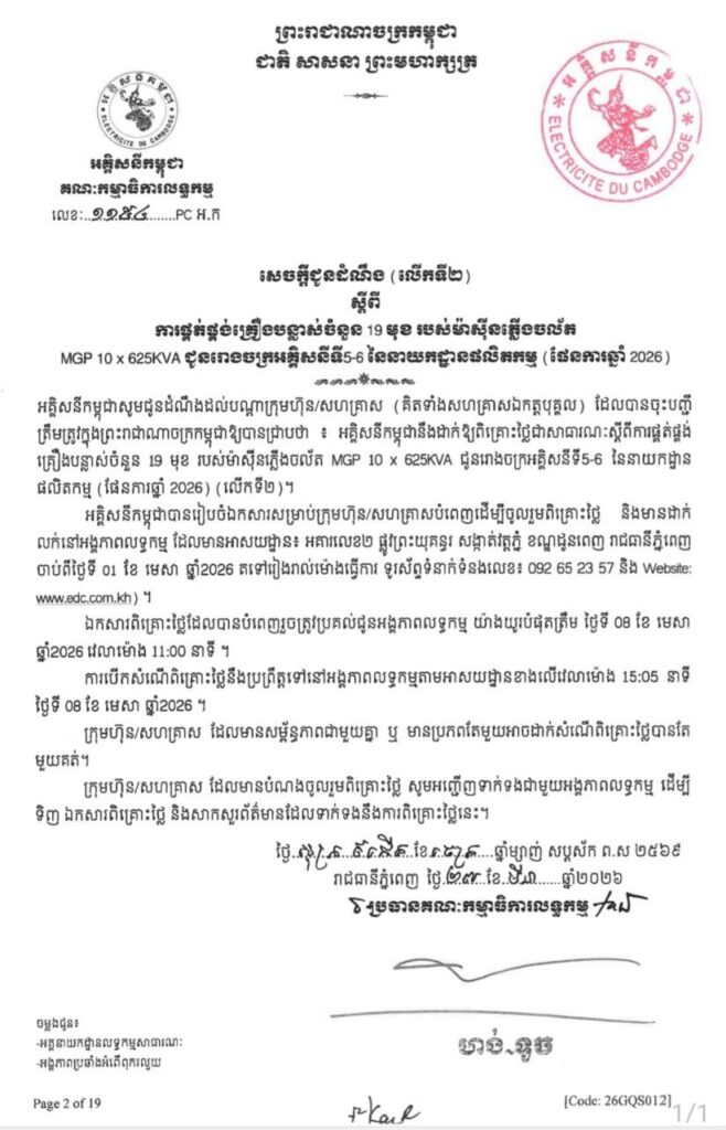 ភ្នំពេញ ៖ អគ្គិសនីកម្ពុជា សូមជូនដំណឹង ដល់បណ្តាក្រុមហ៊ុន/សហគ្រាស (គិតទាំងសហគ្រាសឯកត្តបុគ្គល) ដែលបានចុះបញ្ជី ត្រឹមត្រូវ ក្នុងព្រះរាជាណាចក្រកម្ពុជា ឱ្យបានជ្រាបថា ៖ អគ្គិសនីកម្ពុជា នឹងដាក់ឱ្យពិគ្រោះថ្លៃ ជាសាធារណៈស្តីពីការផ្គត់ផ្គង់ គ្រឿងបន្លាស់ចំនួន 19 មុខ របស់ម៉ាស៊ីនភ្លើងចល័ត MGP 10 x 625KVA ជូនរោងចក្រអគ្គិសនីទី5-6 នៃនាយកដ្ឋាន ផលិតកម្ម (ផែនការឆ្នាំ 2026) (លើកទី២) ។