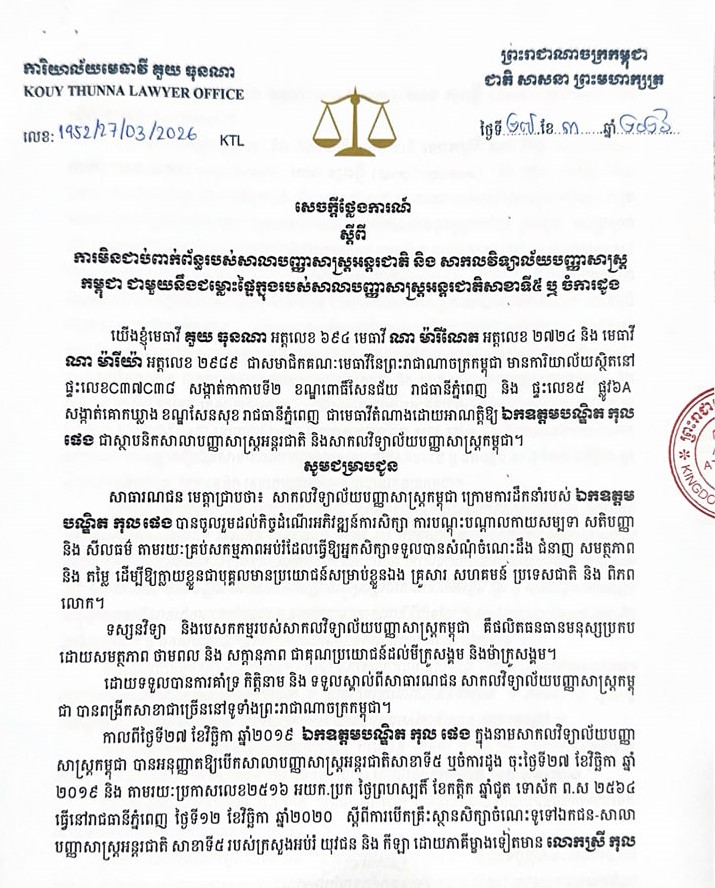 សាកលវិទ្យាល័យបញ្ញាសាស្ត្រកម្ពុជា ប្រកាសមិនពាក់ព័ន្ធ នឹងជម្លោះផ្ទៃក្នុងនៅសាលាបញ្ញាសាស្ត្រអន្តរជាតិ សាខាចំការដូង