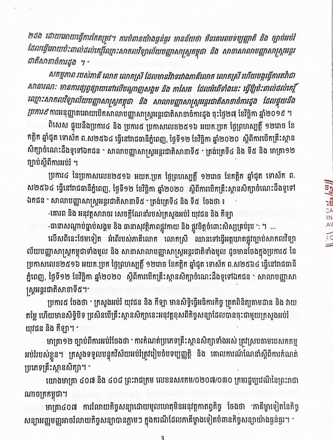 ទន្ទឹមនឹងនេះ សេចក្តីថ្លែងការណ៍ក៏បានរំឮកផងដែរថា តាមប្រការ៥ នៃប្រកាសរបស់ក្រសួងអប់រំ យុវជន និងកីឡា ស្ថាប័នរដ្ឋមានសិទ្ធិបិទគ្រឹះស្ថានសិក្សា ប្រសិនបើគ្រឹះស្ថាននោះអនុវត្តខុសពីកិច្ចសន្យាដែលបានព្រមព្រៀង។