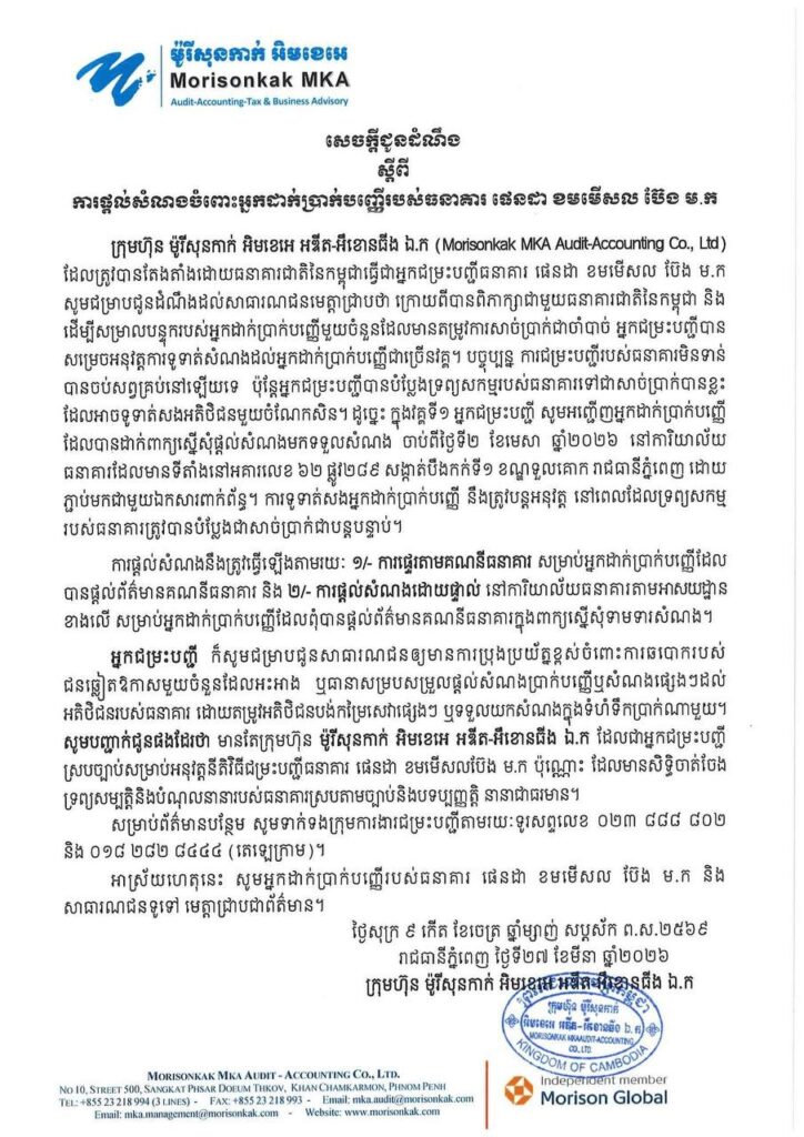 ភ្នំពេញ៖ ក្រុមហ៊ុន ម៉ូរីសិនកាក់ អិមខេអេ អឌីត-អីខោនធីង ឯ.ក Morisonkak MKA ដែលជាអ្នកជម្រះបញ្ជីផ្លូវការ ត្រូវបានតែងតាំងដោយធនាគារជាតិនៃកម្ពុជា បានចេញសេចក្តីជូនដំណឹងស្តីពីការចាប់ផ្តើមផ្តល់សំណងជូនដល់អ្នកដាក់ប្រាក់បញ្ញើរបស់ធនាគារ ផេនដា ខមមើសល ប៊ែង ម.ក Panda Commercial Bank ចាប់ពីដើមខែមេសា ឆ្នាំ២០២៦ ខាងមុខនេះតទៅ។