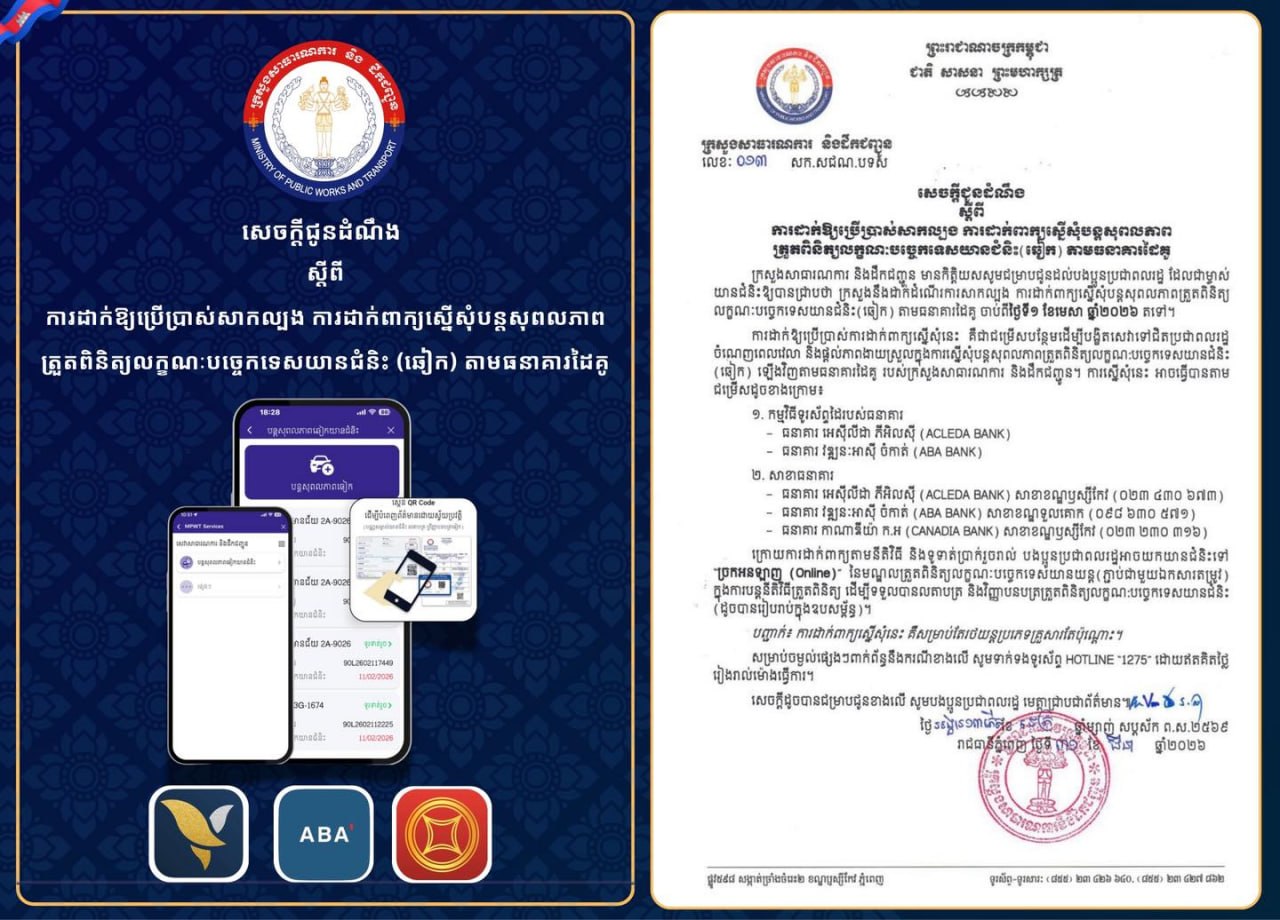 ភ្នំពេញ ៖ ក្រសួងសាធារណការ និងដឹកជញ្ជូន ដាក់ដំណើរការសាកល្បង ការដាក់ពាក្យស្នើសុំបន្តសុពលភាពត្រួតពិនិត្យ លក្ខណៈបច្ចេកទេសយានជំនិះ (ឆៀក) តាមធនាគារដៃគូ ចាប់ពីថ្ងៃទី១ ខែមេសា ឆ្នាំ២០២៦ តទៅ។