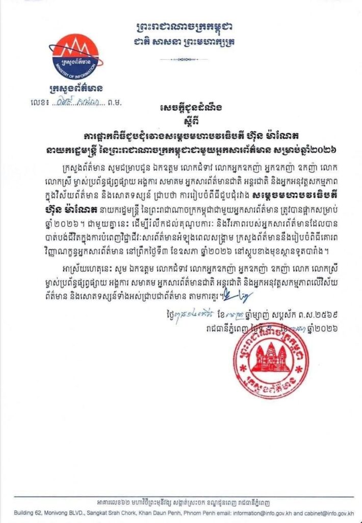 ក្រសួងព័ត៌មាន ផ្អាកពិធីជួបជុំរវាង សម្តេចធិបតី ហ៊ុន ម៉ាណែត ជាមួយអ្នកសារព័ត៌មាន សម្រាប់ឆ្នាំ២០២៦