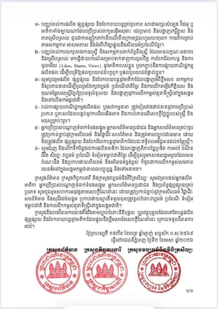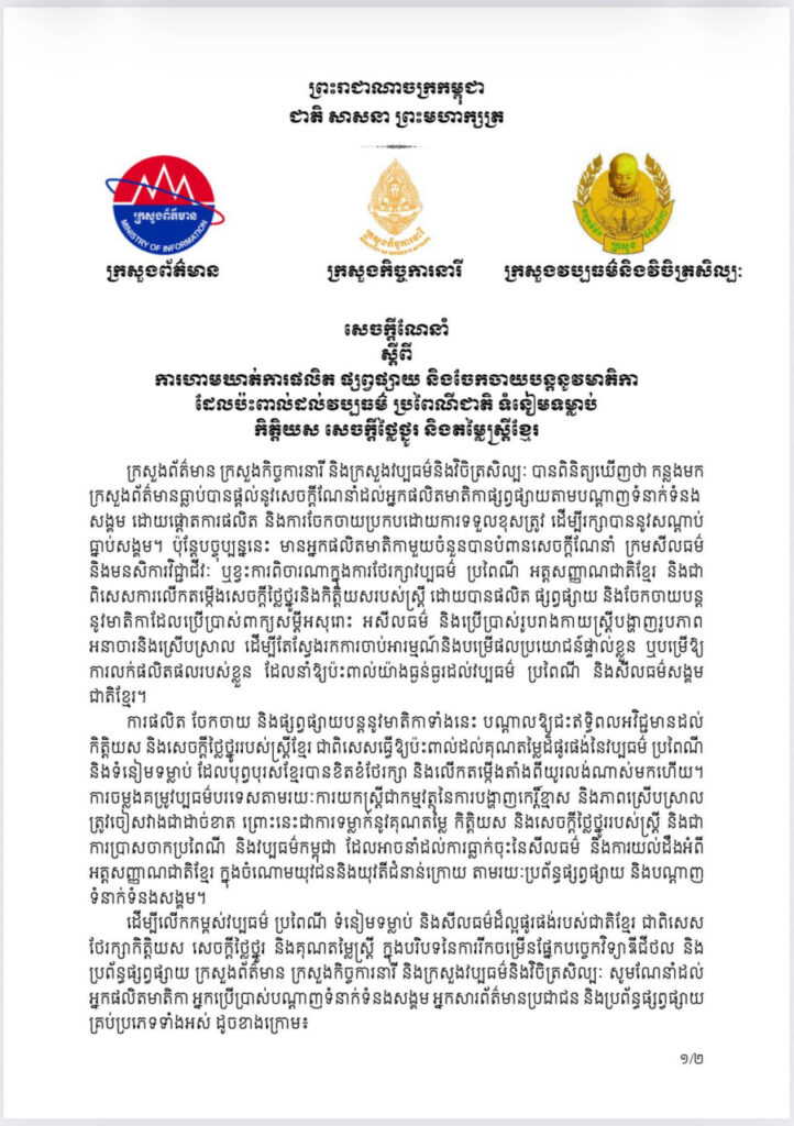 ដើម្បីលើកកម្ពស់វប្បធម៌ ប្រពៃណី ទំនៀមទម្លាប់ និងសីលធម៌ដ៏ល្អផូរផង់របស់ជាតិខ្មែរ ជាពិសេស ថែរក្សាកិត្តិយស សេចក្តីថ្លៃថ្នូរ និងគុណតម្លៃស្ត្រី ក្នុងបរិបទនៃការរីកចម្រើនផ្នែកបច្ចេកវិទ្យាឌីជីថល និង ប្រព័ន្ធផ្សព្វផ្សាយ ក្រសួងព័ត៌មាន ក្រសួងកិច្ចការនារី និងក្រសួងវប្បធម៌និងវិចិត្រសិល្បៈ បានណែនាំដល់ អ្នកផលិតមាតិកា អ្នកប្រើប្រាស់បណ្តាញទំនាក់ទំនងសង្គម អ្នកសារព័ត៌មានប្រជាជន និងប្រព័ន្ធផ្សព្វផ្សាយ គ្រប់ប្រភេទទាំងអស់ បញ្ឈប់រាល់ការផលិត ផ្សព្វផ្សាយ និងចែកចាយបន្តគ្រប់រូបភាព សារជាអក្សរ/សំឡេង វីដេអូ ឬ មាតិកាទាំងឡាយណាដែលប្រើប្រាស់ពាក្យសម្តីអសុរោះ ជេរប្រមាថ និងបង្ហាញកេរ្តិ៍ខ្មាស និងភាពស្រើបស្រាល៕