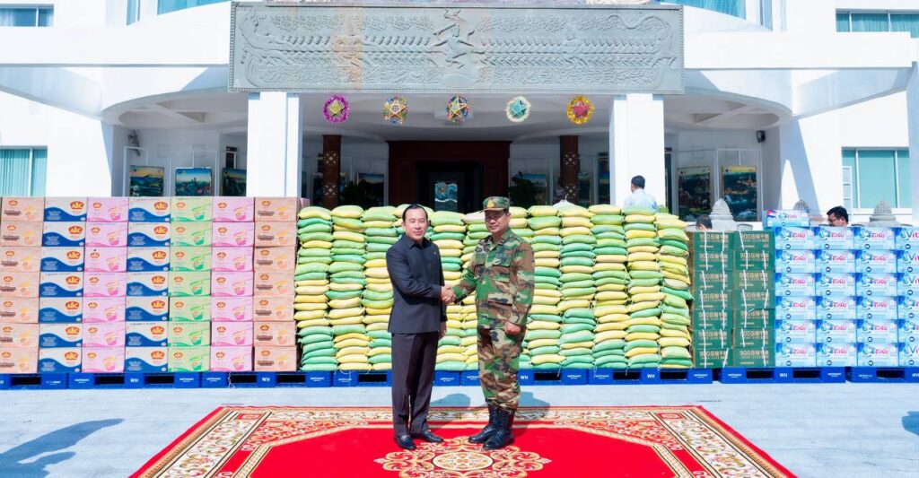 សូមជម្រាបជូនថា អំណោយដ៏ថ្លៃថ្លាខាងលើ រួមមាន៖ អង្ករចំនួន ៥តោន, មីចំនួន ៥០០កេស, ទឹកសុទ្ធចំនួន ១០០០កេស/យួរ, ទឹកត្រីចំនួន ១៥០យួរ, ទឹកស៊ីអ៊ីវចំនួន ១៥០យួរ, ត្រីខចំនួន ១០កេស, នំ ៩០០ចំនួន ១៨កេស, ខ្ទឹមសចំនួន ២បេ, ថ្នាំពេទ្យជាច្រើនមុខ ព្រមទាំងថវិកាមួយចំនួនផងដែរ។