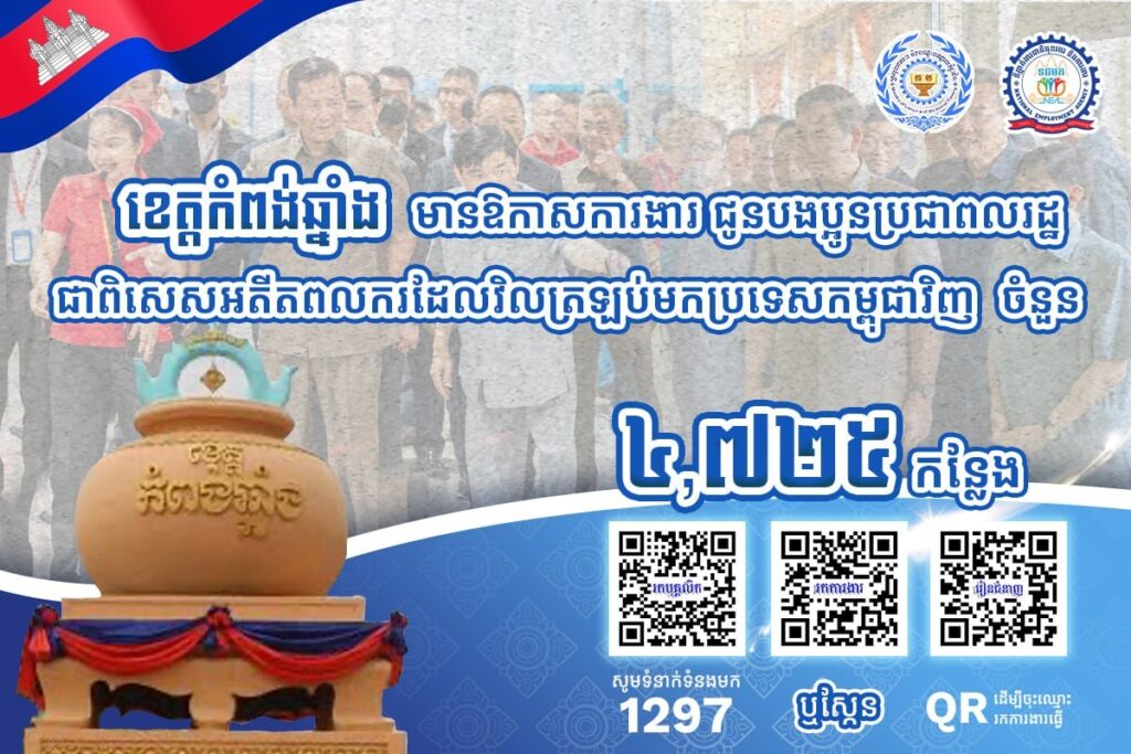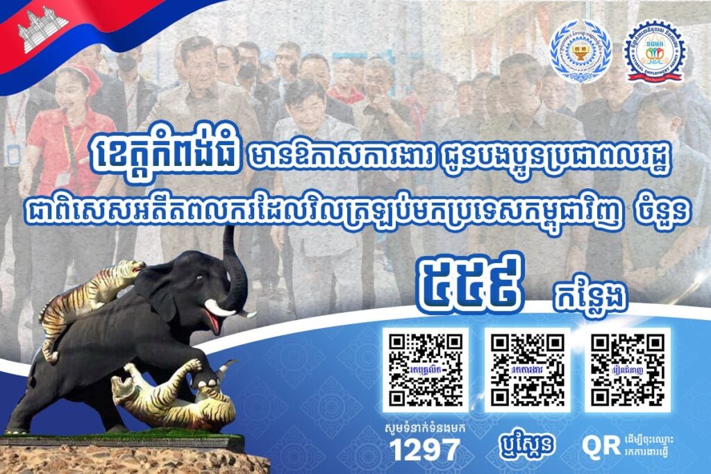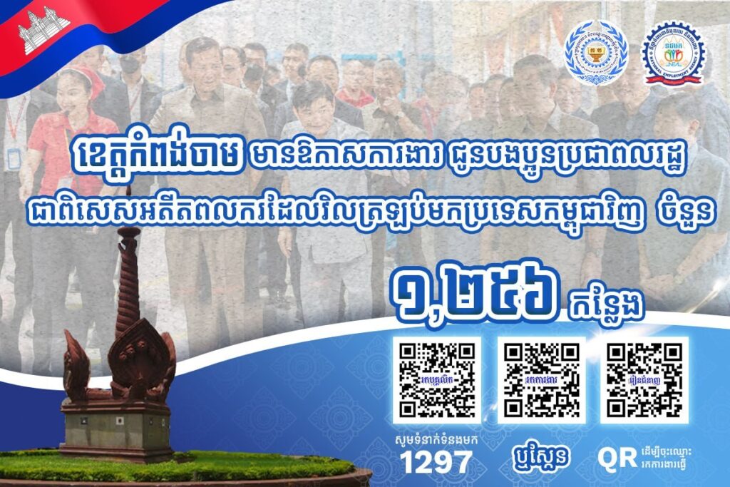 តាមរយៈការផ្សព្វផ្សាយ ក្រសួងការងារបានឱ្យដឹងថា គិតត្រឹមថ្ងៃទី៣ ខែមេសា ឆ្នាំ២០២៦នេះ ខេត្តកំពង់ចាម ខេត្តកំពង់ឆ្នាំង និងខេត្តកំពង់ធំ មានឱកាសការងារ សរុបចំនួន ៦,៥៤០កន្លែង កំពុងរង់ចាំបងប្អូនអតីតពលករ ត្រឡប់មកពីប្រទេសថៃ និងអ្នកកំពុងស្វែងរកការងារ ធ្វើនៅក្នុងវិស័យកសិកម្ម ឧស្សាហកម្ម និងវិស័យសេវាកម្ម ។