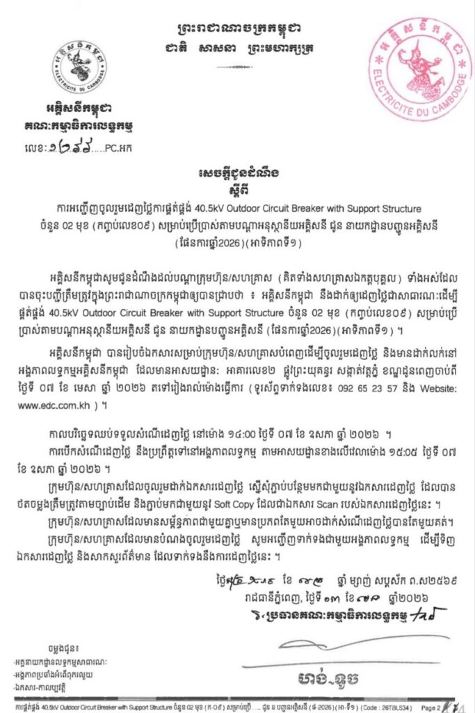 ភ្នំពេញ ៖ អគ្គិសនីកម្ពុជា សូមជូនដំណឹងដល់បណ្តាក្រុមហ៊ុន/សហគ្រាស (គិតទាំងសហគ្រាសឯកត្តបុគ្គល) ទាំងអស់ដែល បានចុះបញ្ជីត្រឹមត្រូវ ក្នុងព្រះរាជាណាចក្រកម្ពុជា ឲ្យបានជ្រាបថា ៖ អគ្គិសនីកម្ពុជា នឹងដាក់ឲ្យដេញថ្លៃ ជាសាធារណៈដើម្បី ផ្គត់ផ្គង់ 40.5kV Outdoor Circuit Breaker with Support Structure ចំនួន 02 មុខ (កញ្ចប់លេខ០៩) សម្រាប់ប្រើ ប្រាស់តាមបណ្តាអនុស្ថានីយអគ្គិសនី ជូន នាយកដ្ឋានបញ្ជូនអគ្គិសនី (ផែនការឆ្នាំ2026) (អាទិភាពទី១) ។