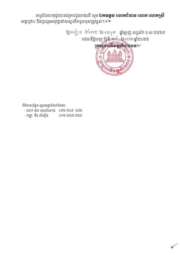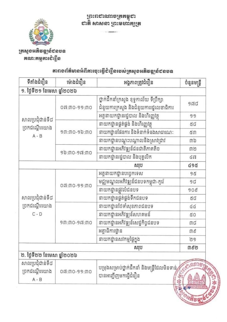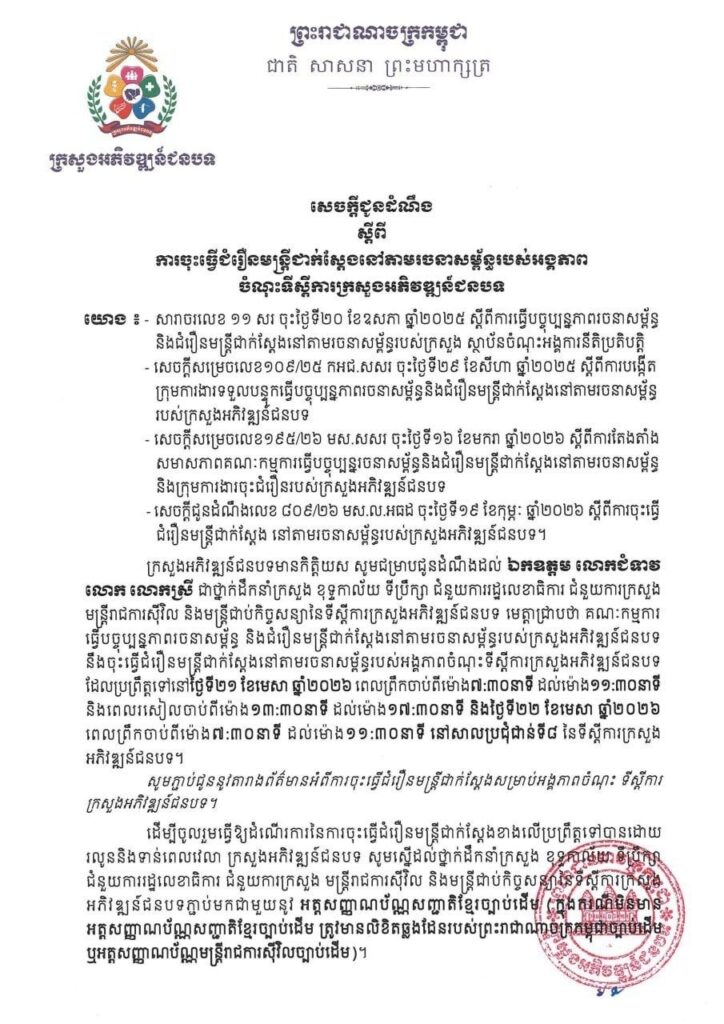 ភ្នំពេញ៖ គណៈកម្មការ ធ្វើបច្ចុប្បន្នភាព រចនាសម្ព័ន្ធ និងជំរឿនមន្ត្រីជាក់ស្ដែង នៅតាមរចនាសម្ព័ន្ធ របស់ក្រសួងអភិវឌ្ឍន៍ជនបទ នឹងចុះធ្វើជំរឿនមន្ត្រីជាក់ស្តែង នៅតាមរចនាសម្ព័ន្ធ របស់អង្គភាពចំណុះ ទីស្តីការក្រសួងអភិវឌ្ឍន៍ជនបទ ដែលប្រព្រឹត្តទៅនៅថ្ងៃទី២១ ខែមេសា ឆ្នាំ២០២៦ ពេលព្រឹកចាប់ពីម៉ោង៧:៣០នាទី ដល់ម៉ោង១១:៣០នាទី និងពេលរសៀលចាប់ពីម៉ោង១៣:៣០នាទី ដល់ម៉ោង១៧:៣០នាទី និងថ្ងៃទី២២ ខែមេសា ឆ្នាំ២០២៦ ពេលព្រឹកចាប់ពីម៉ោង៧:៣០នាទី ដល់ម៉ោង១១:៣០នាទី នៅសាលប្រជុំជាន់ទី៨ នៃទីស្តីការក្រសួង អភិវឌ្ឍន៍ជនបទ។