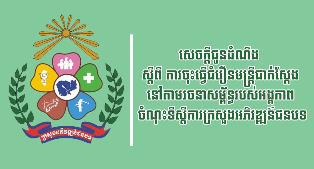 ដើម្បីចូលរួមធ្វើឱ្យដំណើរការ នៃការចុះធ្វើជំរឿនមន្ត្រីជាក់ស្ដែងខាងលើ ប្រព្រឹត្តទៅបានដោយ រលូននិងទាន់ពេលវេលា ក្រសួងអភិវឌ្ឍន៍ជនបទ សូមស្នើដល់ថ្នាក់ដឹកនាំក្រសួង ខុទ្ទកាល័យទីប្រឹក្សា ជំនួយការរដ្ឋលេខាធិការ ជំនួយការក្រសួង មន្ត្រីរាជការស៊ីវិល និង មន្ត្រីជាប់កិច្ចសន្យានៃទីស្ដីការក្រសួង អភិវឌ្ឍន៍ជនបទ ភ្ជាប់មកជាមួយនូវ អត្តសញ្ញាណប័ណ្ណ សញ្ជាតិខ្មែរច្បាប់ដើម (ក្នុងករណីមិនមាន អត្តសញ្ញាណប័ណ្ណសញ្ជាតិខ្មែរច្បាប់ដើម ត្រូវមានលិខិតឆ្លងដែន របស់ព្រះរាជាណាចក្រកម្ពុជាច្បាប់ដើម ឬអត្តសញ្ញាណប័ណ្ណមន្ត្រីរាជការស៊ីវិលច្បាប់ដើម)៕