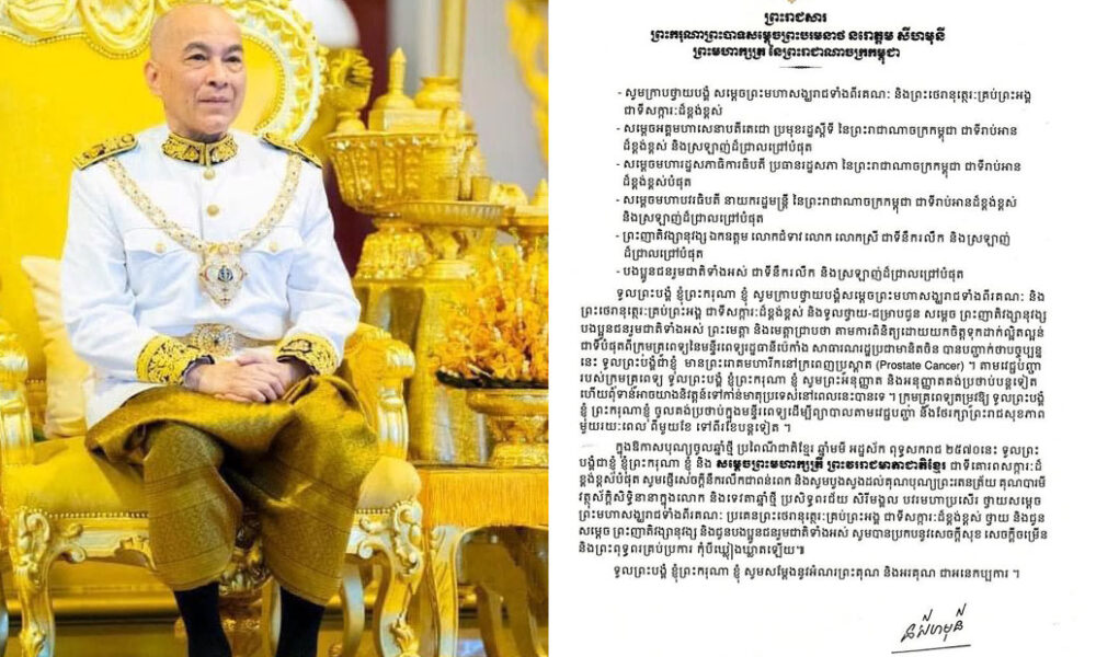 ភ្នំពេញ ៖ ព្រះករុណា ព្រះបាទ សម្តេចព្រះ បរមនាថ នរោត្តម សីហមុនី ព្រះមហាក្សត្រកម្ពុជា នៅថ្ងៃទី១០ ខែមេសា ឆ្នាំ២០២៦ មានព្រះបន្ទូលថា ព្រះអង្គ មានព្រះរោគមហារីកនៅក្រពេញប្រូស្តាត តាមវេជ្ជបញ្ជារបស់ក្រុមគ្រូពេទ្យ ត្រូវគង់ប្រថាប់នៅមន្ទីរពេទ្យបន្តទៀត ហើយពុំទាន់អាចយាងនិវត្តន៍ទៅកាន់មាតុប្រទេស់នៅពេលនេះបានទេ៕