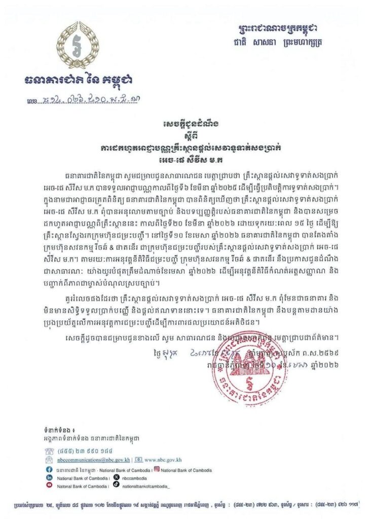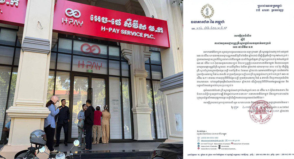 ភ្នំពេញ៖ ធនាគារជាតិនៃកម្ពុជា បានចេញសេចក្តីជូនដំណឹងជាសាធារណៈ ស្តីពីការសម្រេចដកហូតអាជ្ញាប័ណ្ណជាស្ថាពរពីគ្រឹះស្ថានផ្តល់សេវាទូទាត់សងប្រាក់ អេច-ផេ សឺវីស ម.ក H-Pay Civil Co., Ltd បន្ទាប់ពីរកឃើញថាគ្រឹះស្ថាននេះមិនបានអនុវត្តតាមច្បាប់ និងបទបញ្ញត្តិជាធរមាន។