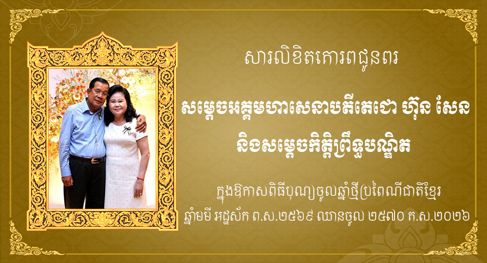 ជាថ្មីម្ដងទៀត ខ្ញុំសូមគោរពប្រសិទ្ធពរជ័យ សិរីមង្គល វិបុលសុខ បវរមហាប្រសើរ ជូនចំពោះសម្ដេចតេជោ ហ៊ុន សែន និងកិត្តិព្រឹទ្ធបណ្ឌិត ប៊ុនរ៉ានី ហ៊ុនសែន ព្រមទាំងបុត្រាបុត្រី ចៅប្រុសចៅស្រី សូមប្រកបដោយពរទាំងឡាយប្រាំប្រការគឺ អាយុ វណ្ណៈ សុខៈ ពលៈ និងបដិភាណៈ កុំបីឃ្លៀងឃ្លាតឡើយ៕