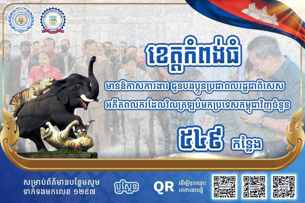 តាមរយៈការផ្សព្វផ្សាយ ក្រសួងការងារបានឱ្យដឹងថា គិតត្រឹមថ្ងៃទី ១៣ ខែមេសា ឆ្នាំ២០២៦នេះ ខេត្តកំពង់ចាម ខេត្តកំពង់ឆ្នាំង និងខេត្តកំពង់ធំមានឱកាសការងារសរុបចំនួន ៦,៨៦១កន្លែង កំពុងរង់ចាំបងប្អូនអតីតពលករត្រឡប់មកពីប្រទេសថៃ និងអ្នកកំពុងស្វែងរកការងារធ្វើនៅក្នុងវិស័យកសិកម្ម ឧស្សាហកម្ម និងវិស័យសេវាកម្ម។